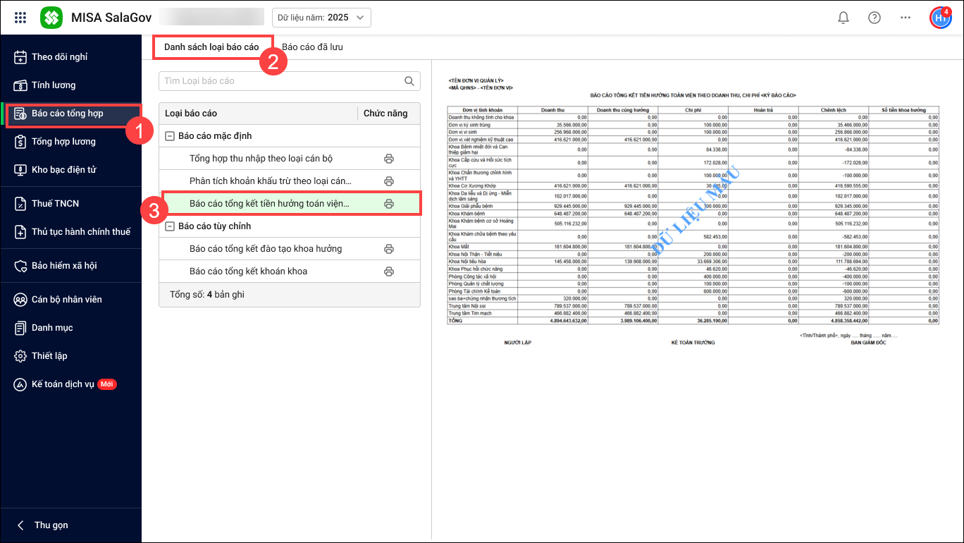 - Vào Báo cáo tổng hợp/Danh sách báo cáo/Báo cáo tổng kết tiền hưởng toán viện theo doanh thu,chi phí