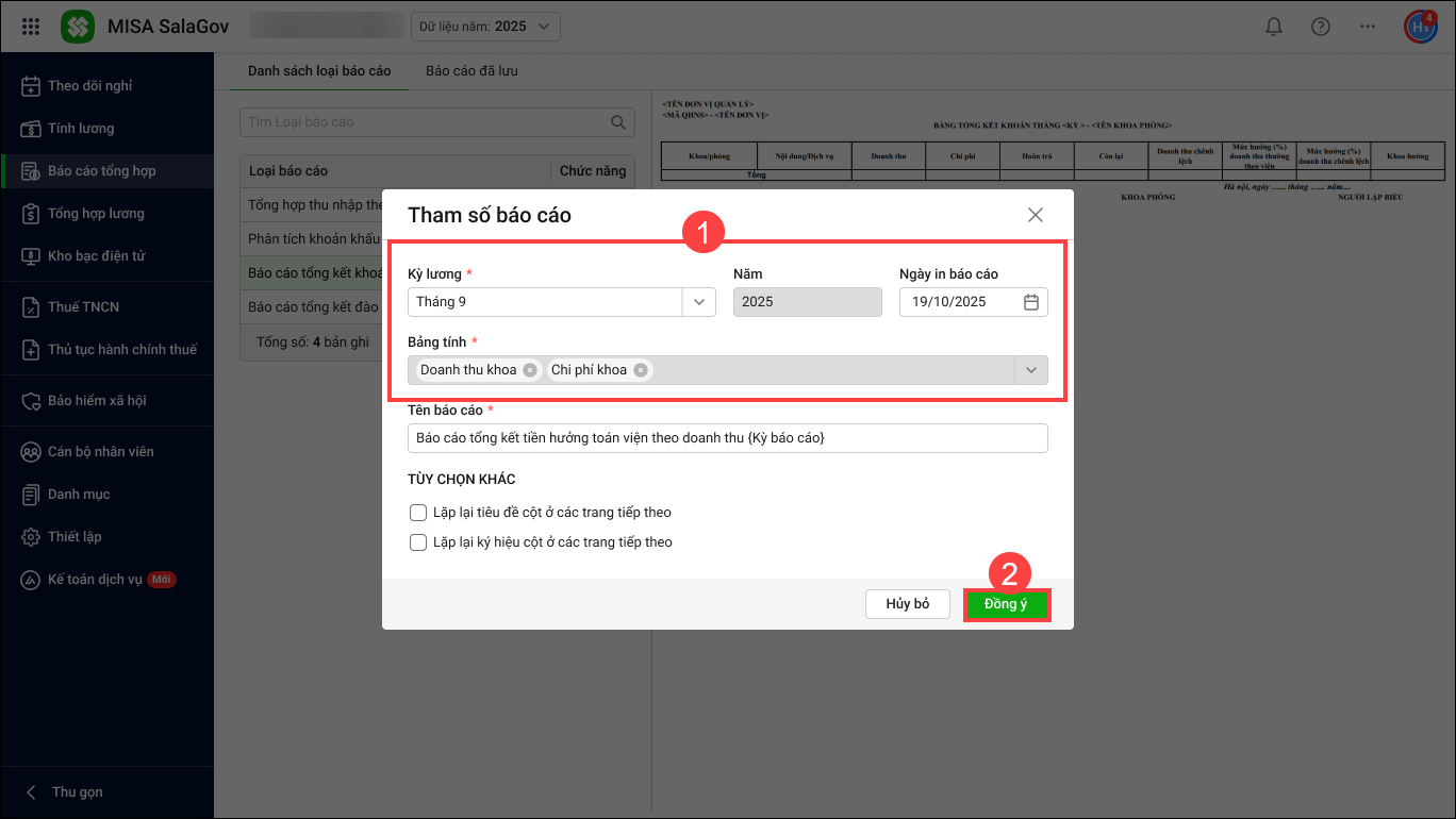- Bảng tính: Chọn bảng tính doanh thu khoa và chi phí khoa
