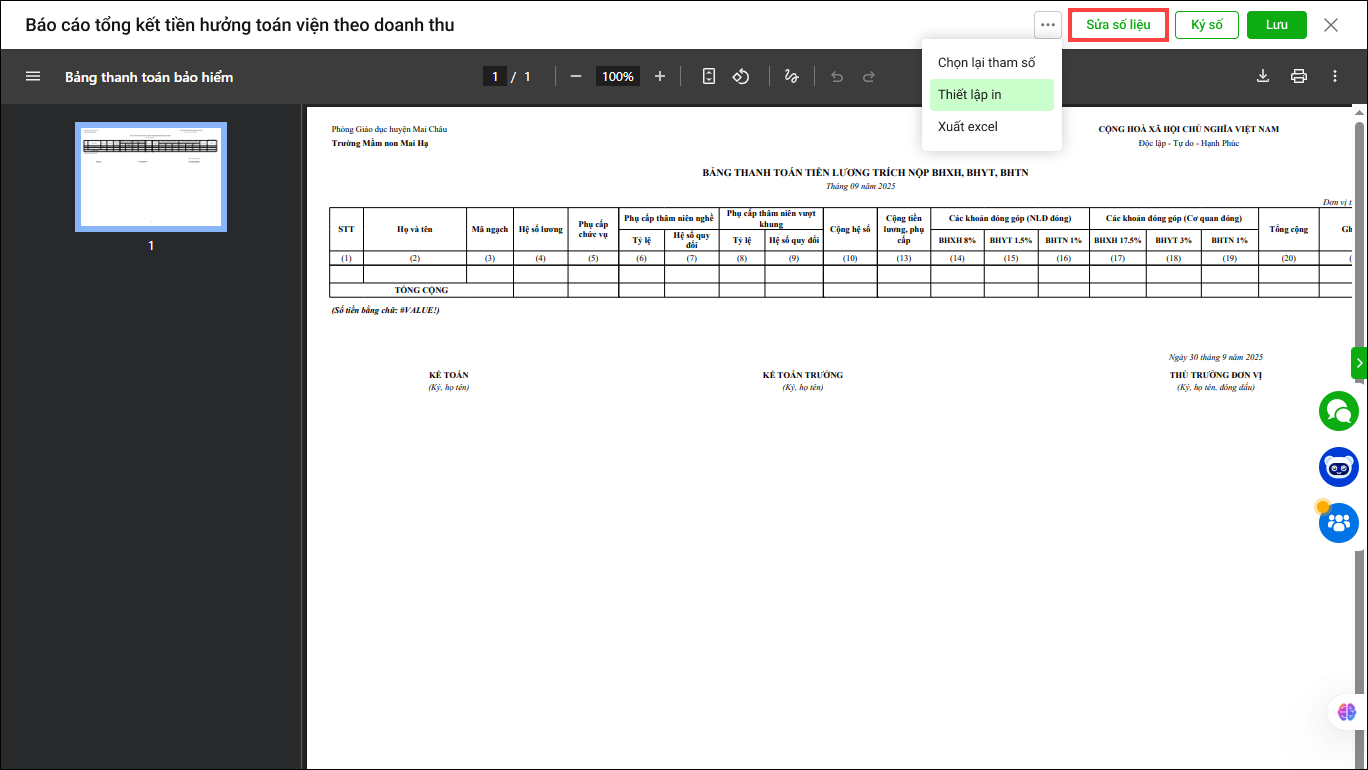 4. Nhấn Sửa số liệu nếu anh/chị cần cập nhật lại số liệu trong báo cáo
