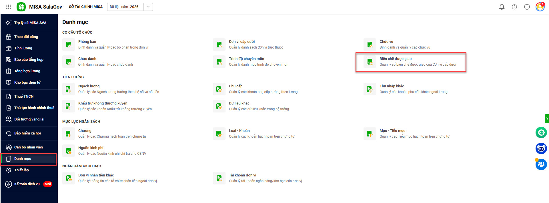 Bước 1. Vào menu Danh mục\Biên chế được giao.