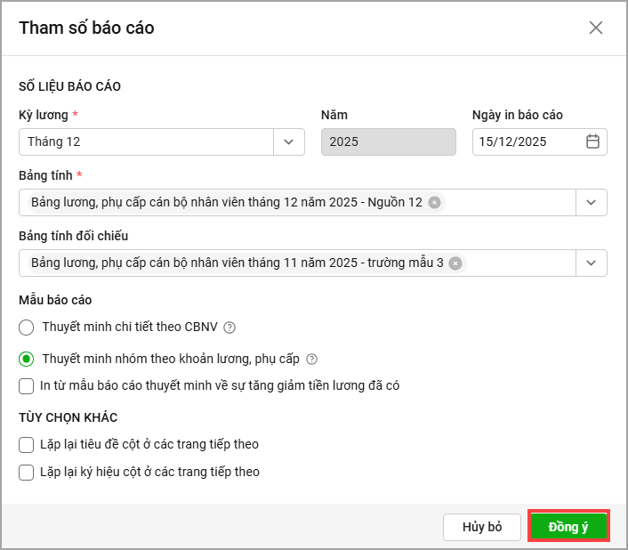 - Tại mục Mãu báo cáo, tích chọn Thuyết minh nhóm theo khoản lương, phụ cấp