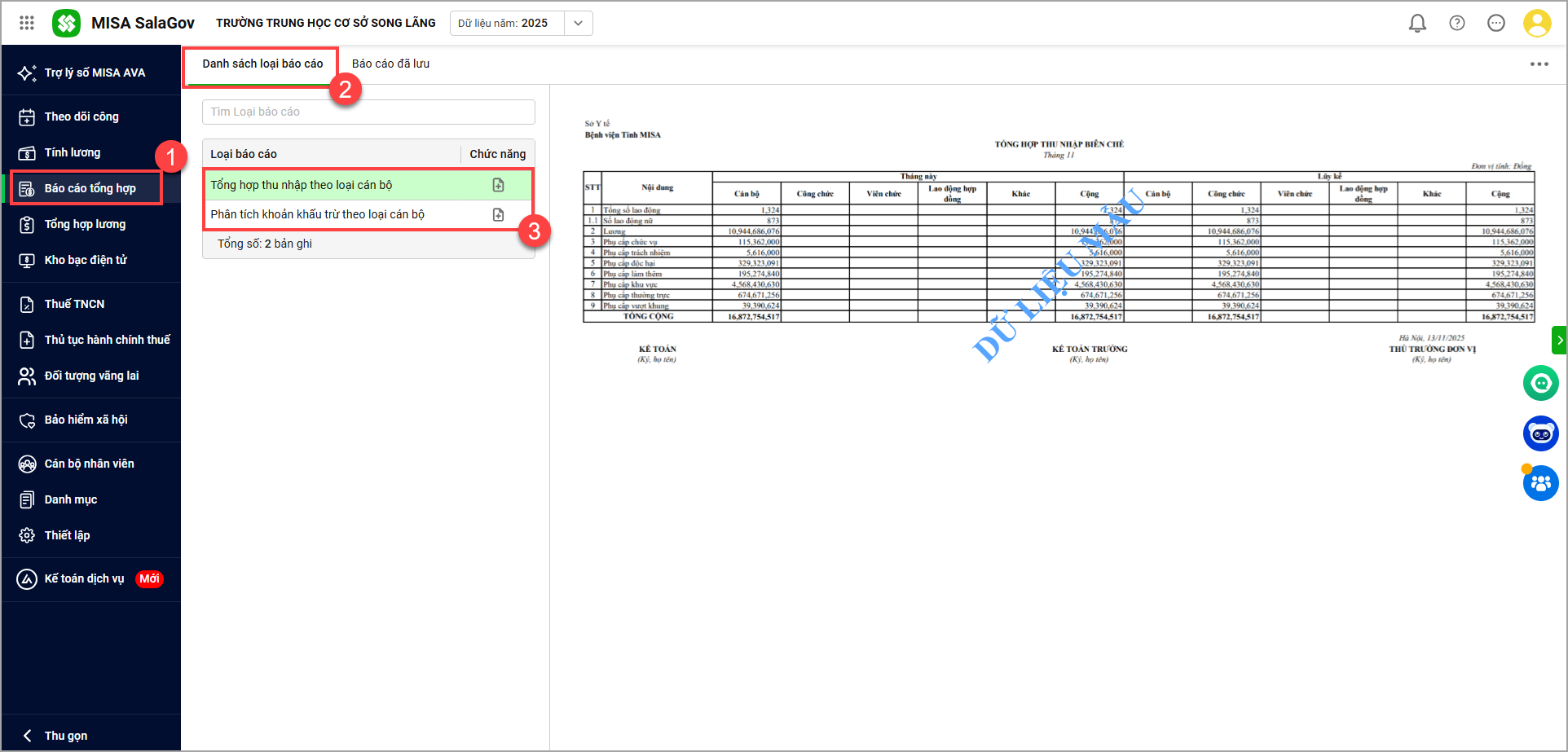 - Vào Báo cáo tổng hợp/danh sách loại báo cáo sau đó lựa chọn 1 trong 2 loại báo cáo: Tổng hợp thu nhập theo loại cán bộ hoặc phân tích khấu trừ theo loại cán bộ