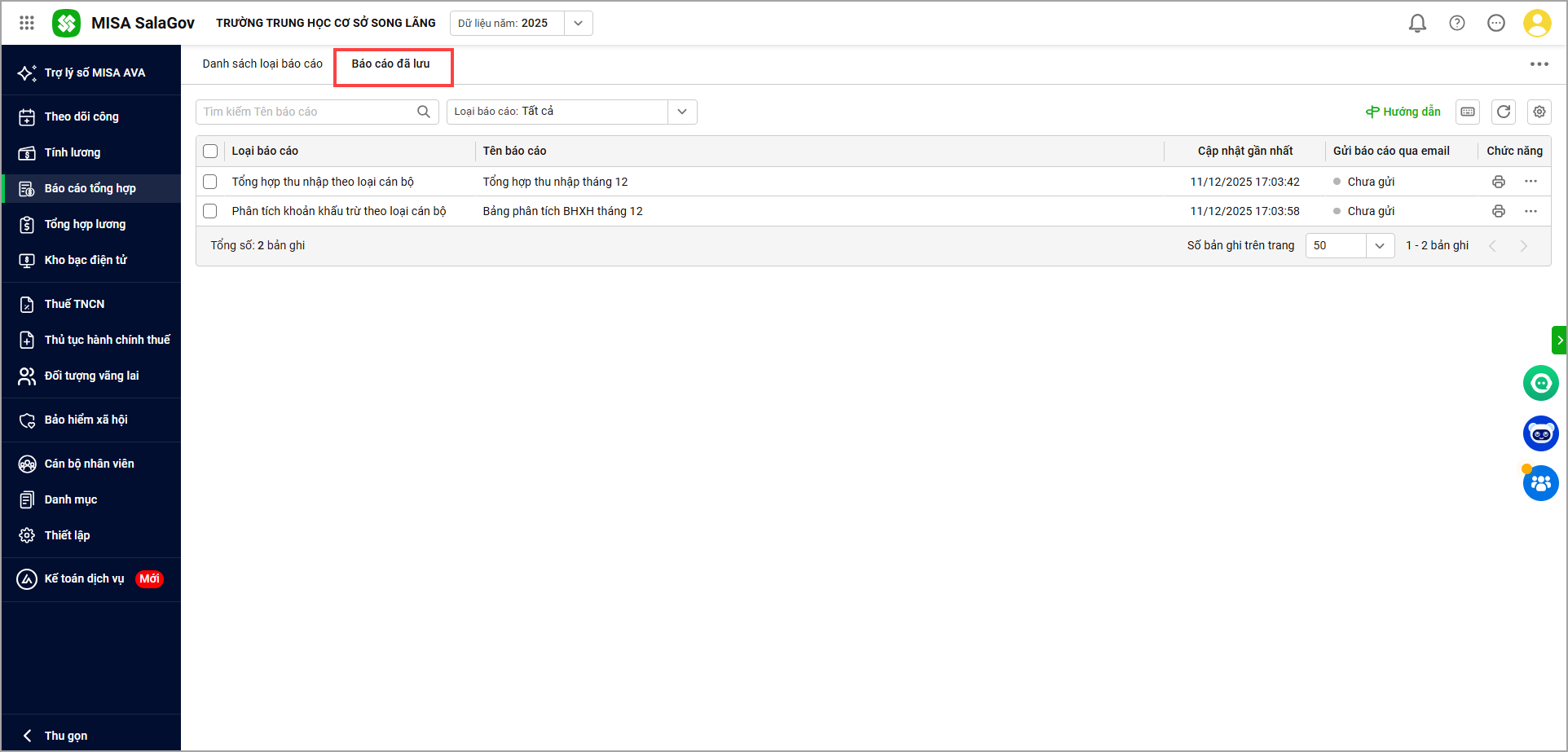 - Sau khi lập xong báo cáo tổng hợp, anh/chị vào mục Báo cáo đã lưu.