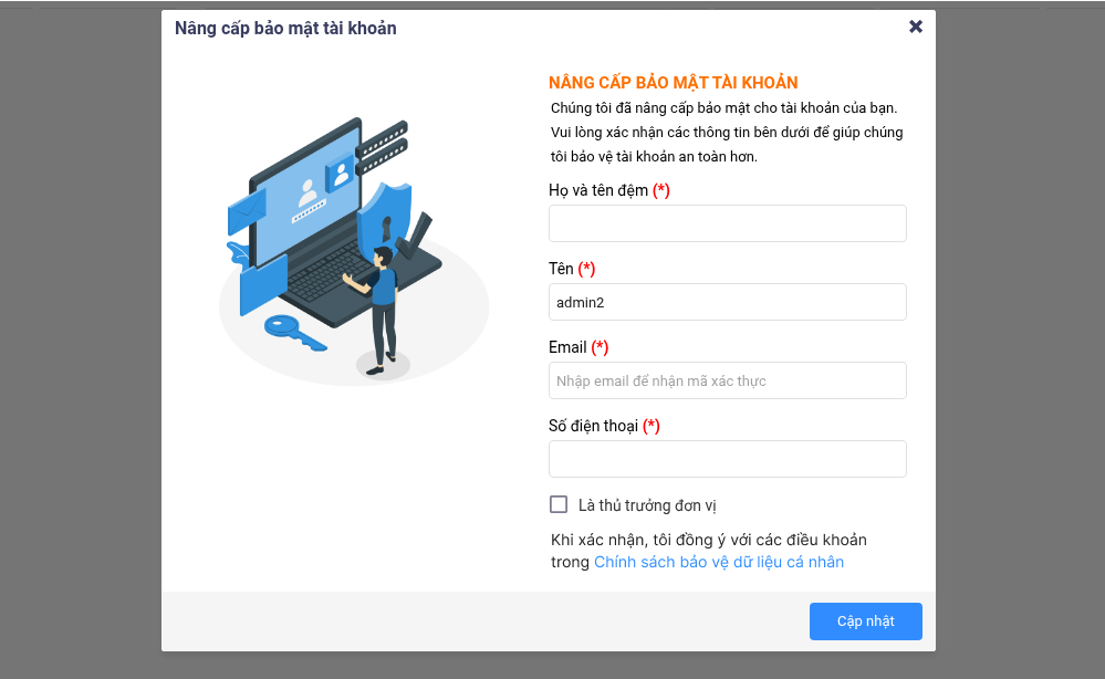 - Tại màn hình Nâng cấp bảo mật tài khoản, bổ sung ô Là thủ trưởng đơn vị, khi xác nhận, tôi đồng ý với các điều khoản trong Chính sách bảo vệ dữ liệu cá nhân.