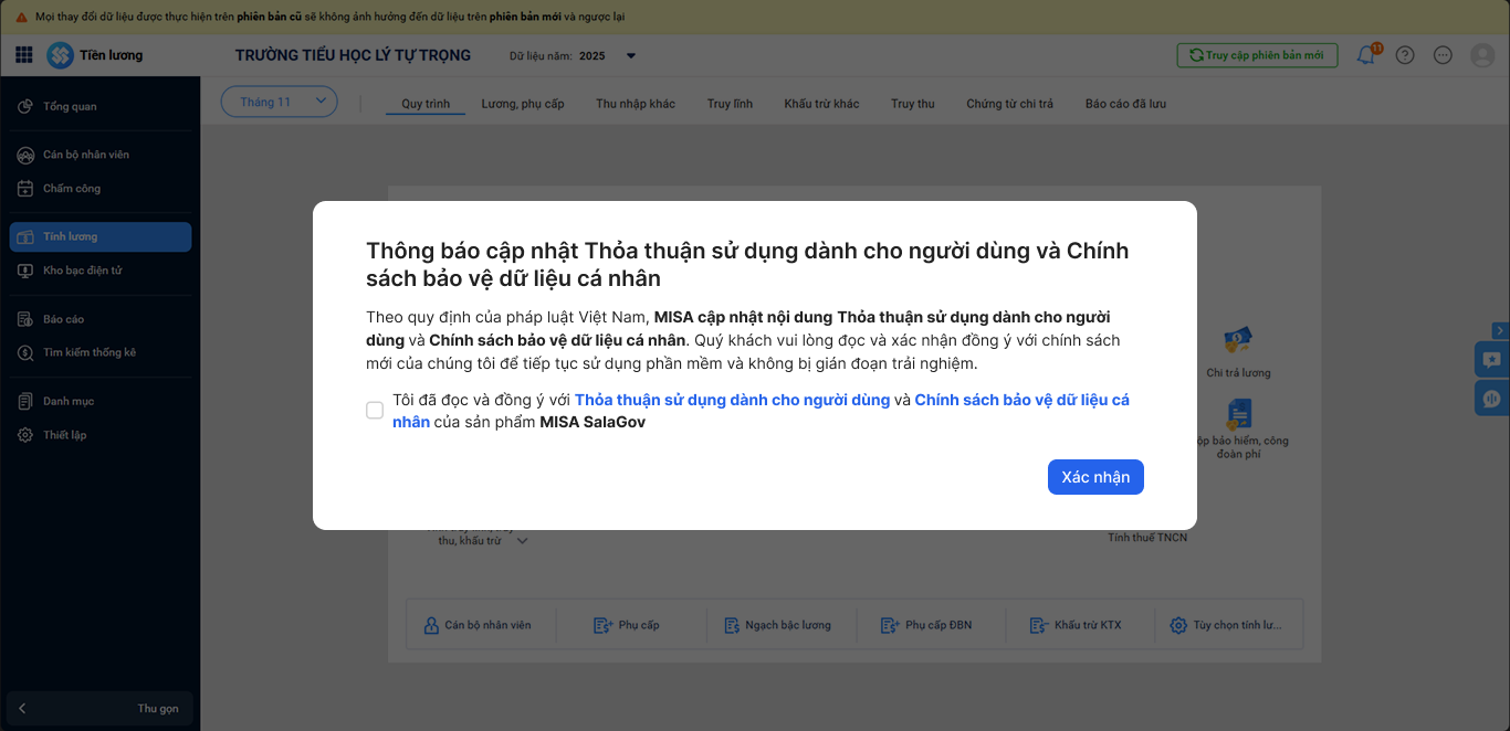 Phần mềm MISA SALAGOV tiến hành cập nhật chính sách bảo vệ dữ liệu cá nhân tại một số tính năng/vị trí trên phần mềm. Cụ thể như sau: