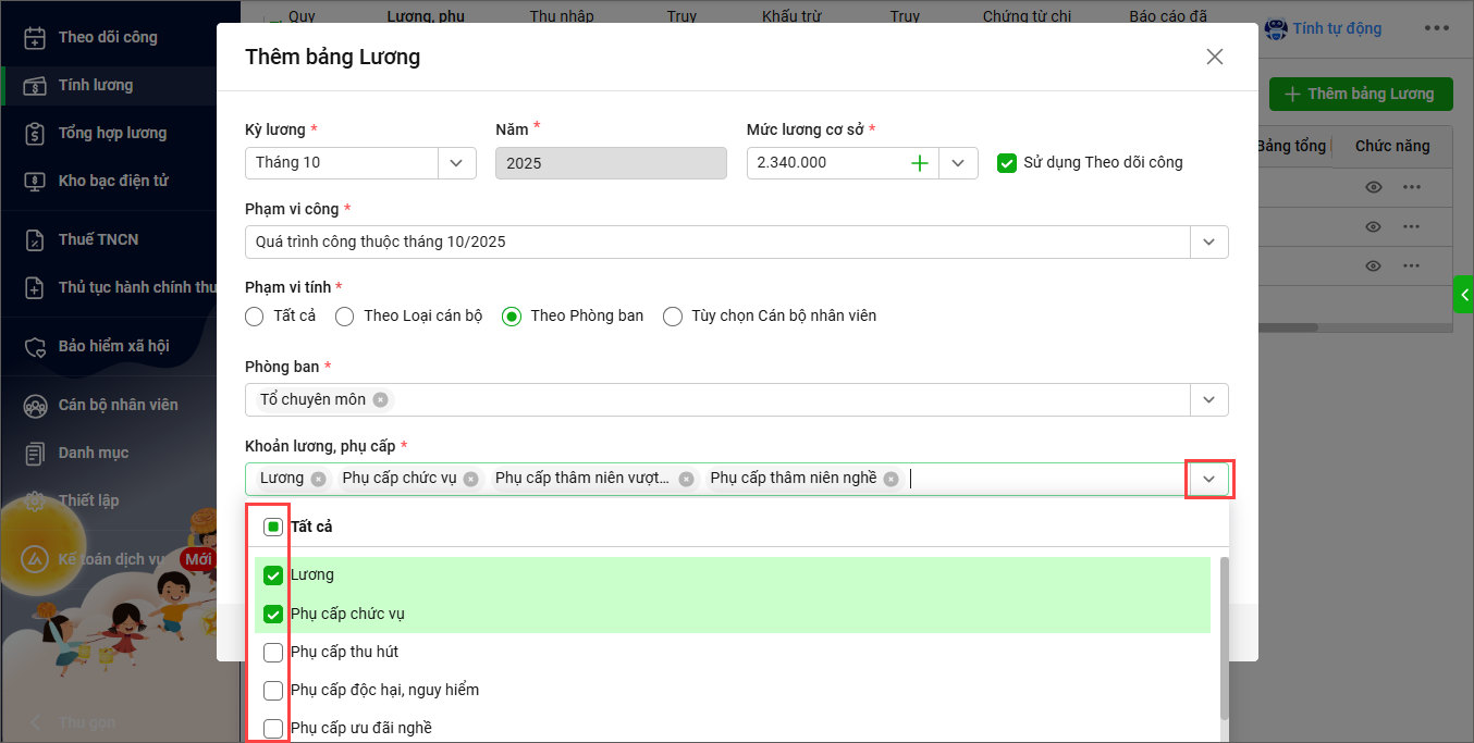 - Tại mục Khoản lương, phụ cấp, tích chọn Lương, Phụ cấp chức vụ, Phụ cấp thâm niên vượt khung, Phụ cấp thâm niên nghề.