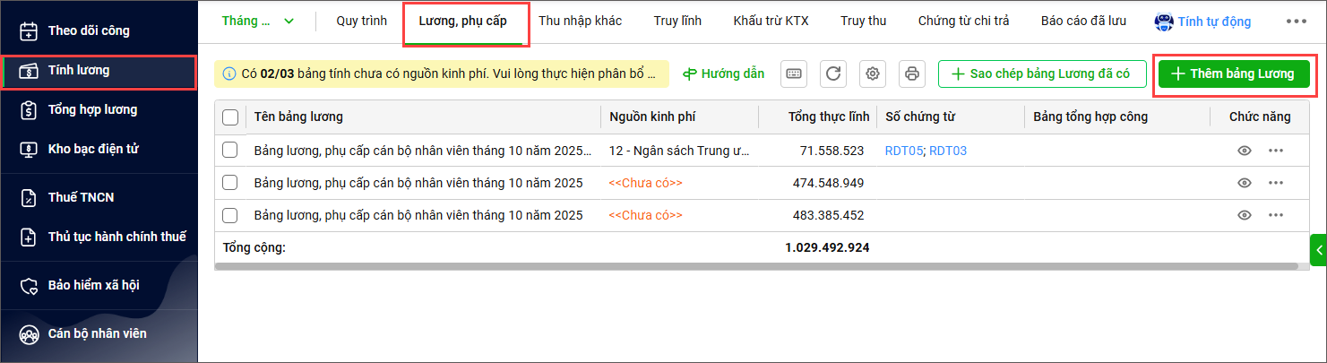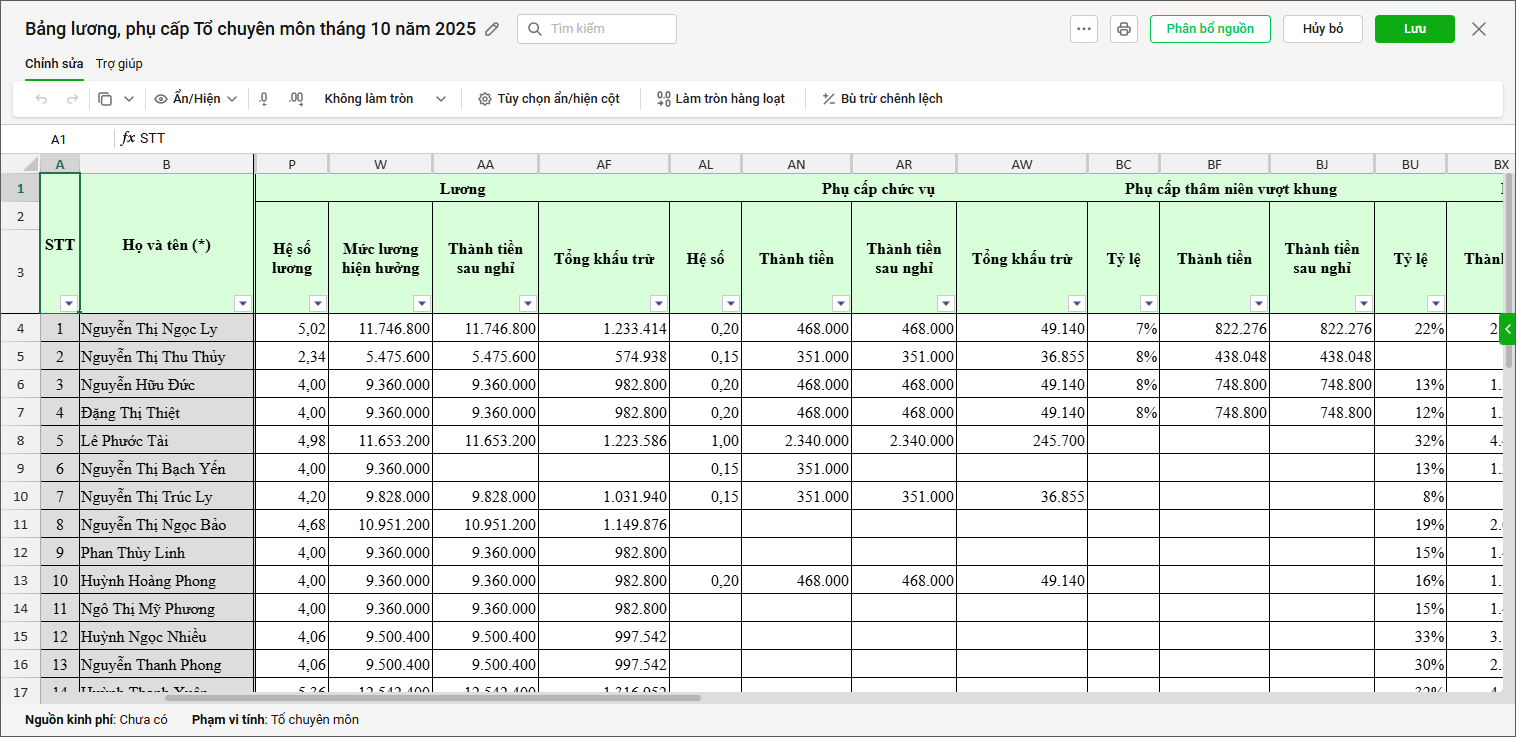 - Hệ thống tự động lập bảng tính lương cho các đối tượng cán bộ nhân viên thuộc Tổ chuyên môn có phát sinh các khoản lương, phụ cấp anh/chị chọn ở bước trước.