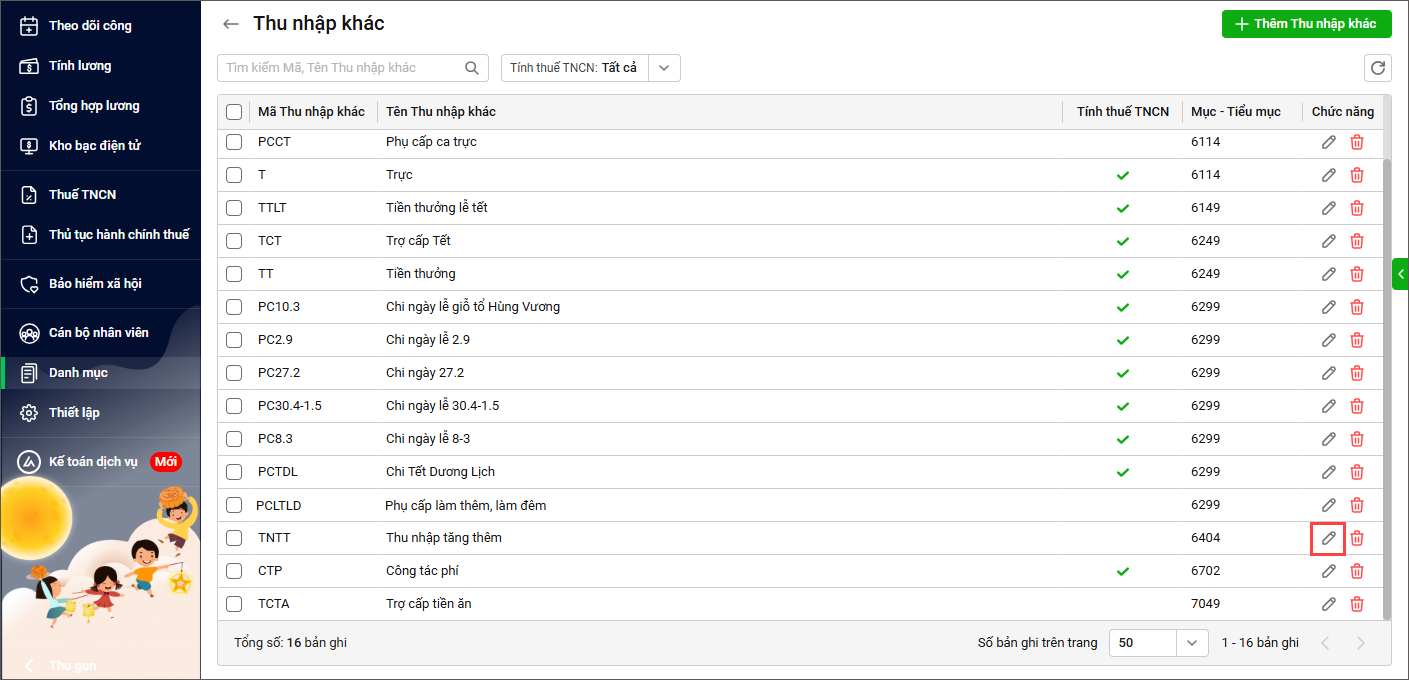 • Nhấn Sửa tại Thu nhập tăng thêm.