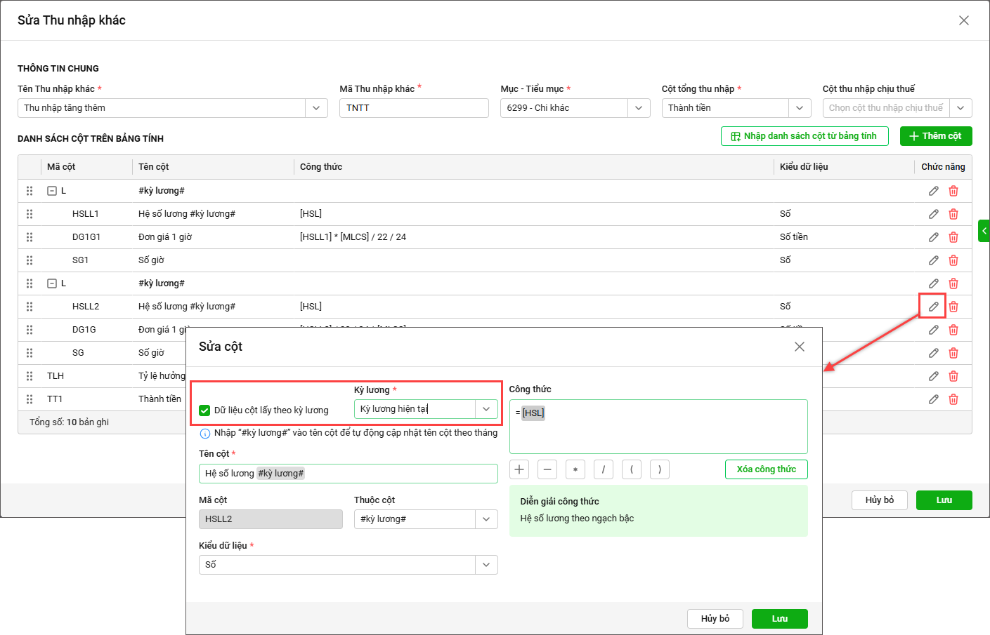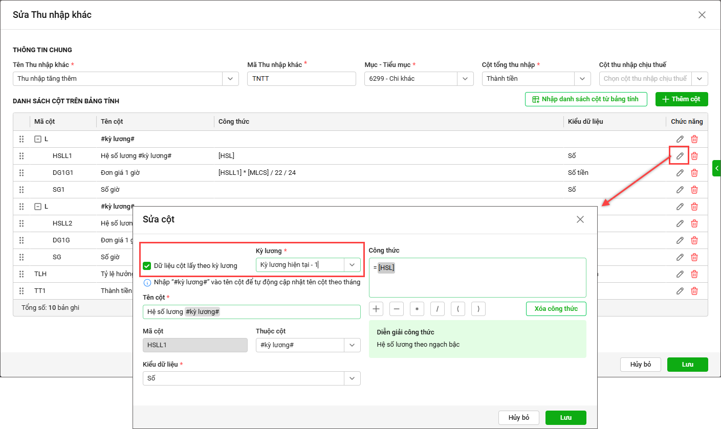 • Thiết lập các cột lấy theo kỳ lương bằng cách nhấn Sửa cột.