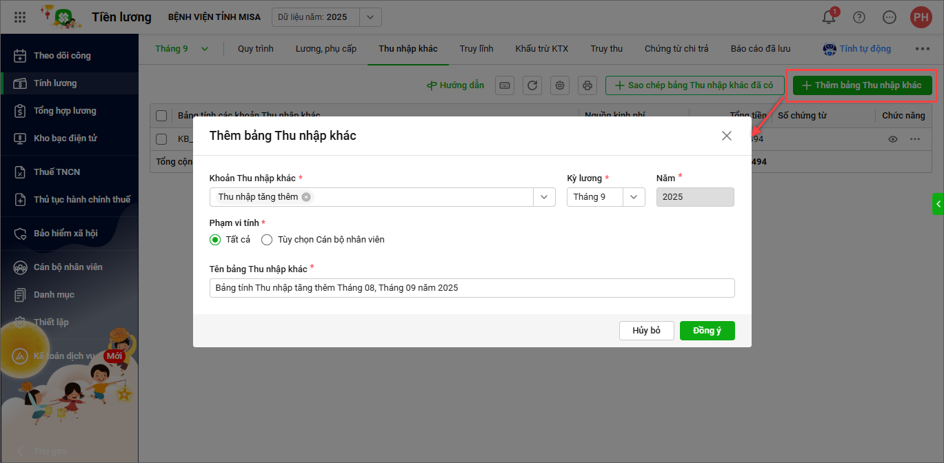 • Nhấn Thêm bảng Thu nhập khác  chọn tham số tương ứng:
