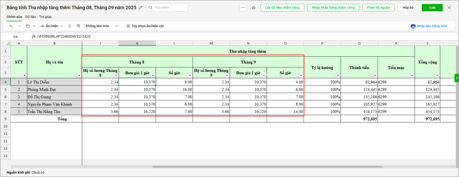 *Ví dụ: Vào thời điểm tháng 9, anh/chị muốn lập bảng tính Thu nhập tăng thêm có công thức tính từ hệ số lương của 2 tháng liên tiếp: Tháng 8 và Tháng 9.