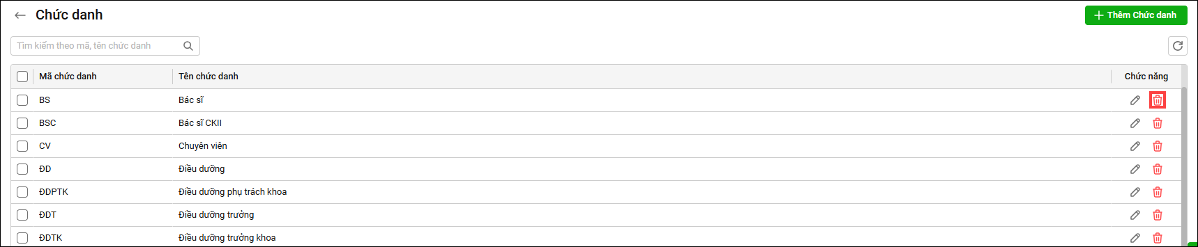 Bước 2:  Nếu muốn xóa chức danh, nhấn vào biểu tượng thùng rác tại chức danh cần xóa, chọn Xóa.