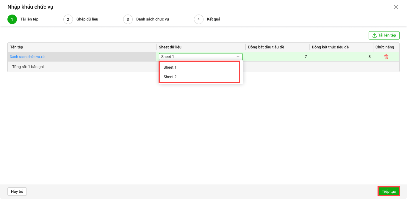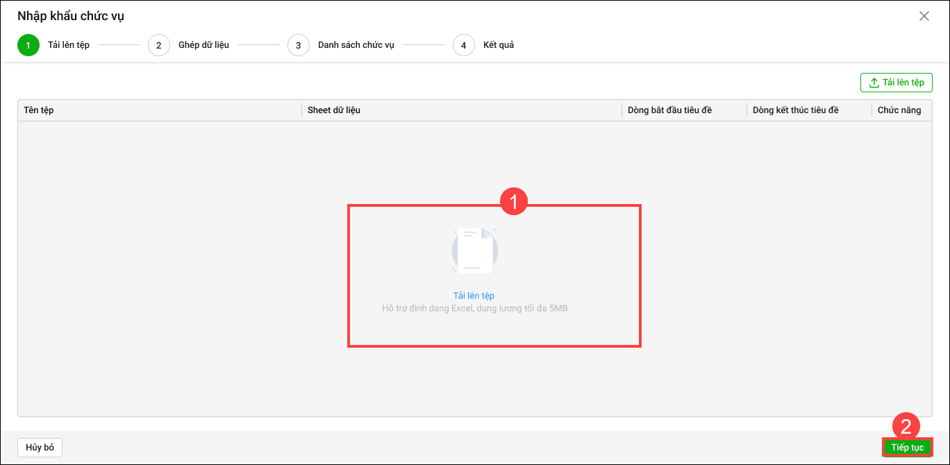 • Tải lên tệp dữ liệu chức vụ muốn khai báo. Sau đó nhấn Tiếp tục