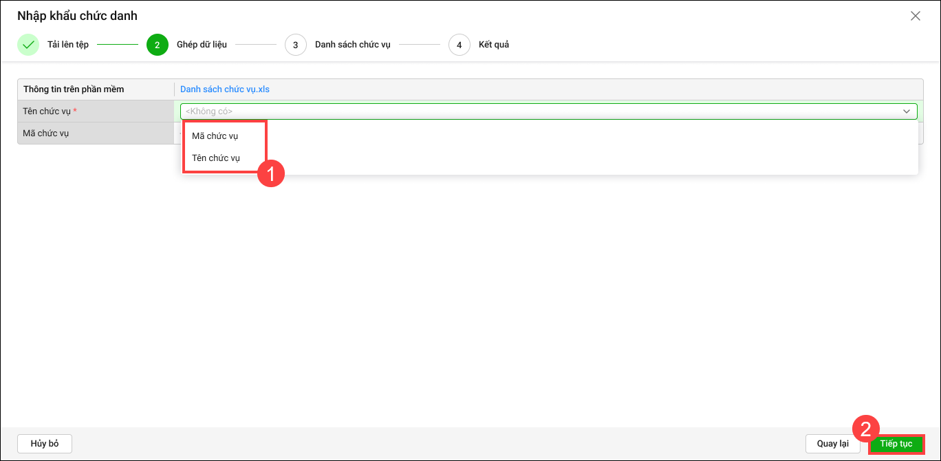 5. Chương trình tự động ghép thông tin tên chức vụ, mã chức vụ trên phần mềm với tên chức vụ, mã chức vụ trên file vừa tải lên. Nếu chương trình chưa ghép dữ liệu hoặc ghép chưa đúng, anh chị có thể chọn lại thông tin để ghép cho chính xác. Sau đó nhấn Tiếp tục