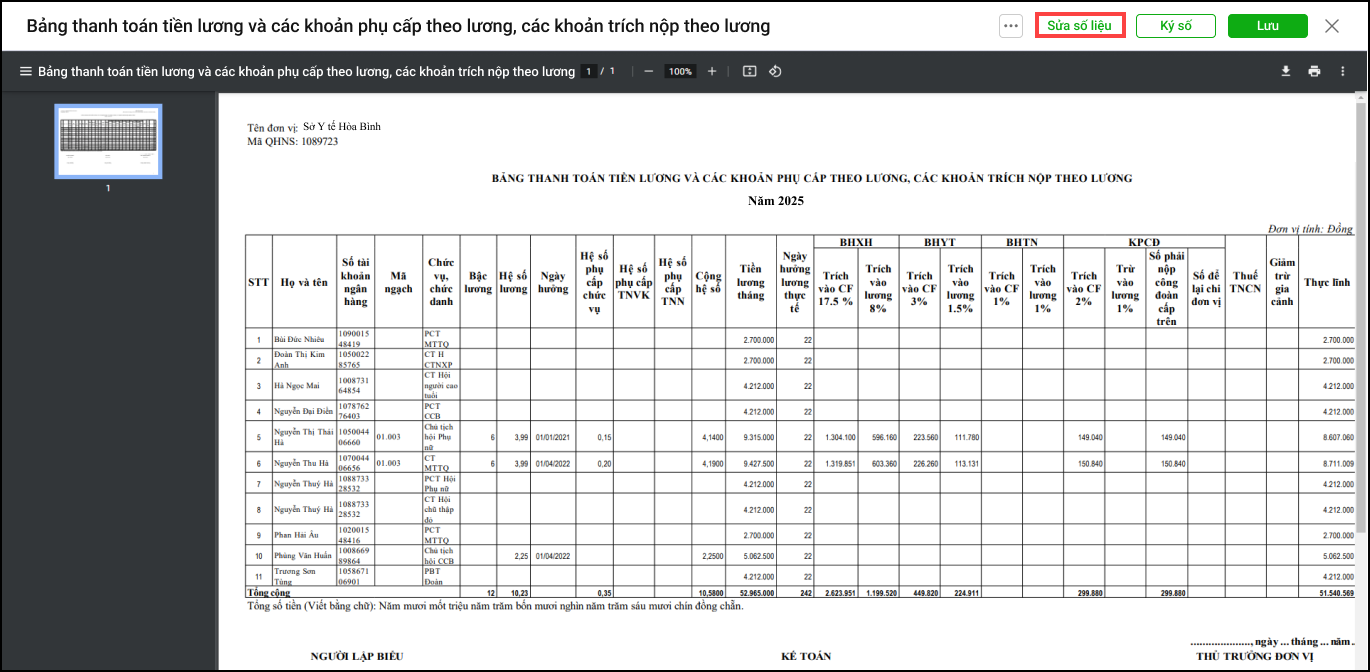 3. Phần mềm hiển thị bảng thanh toán tiền lương và các khoản phụ cấp theo lương, các khoản trích nộp theo lương được tổng hợp từ nhiều bảng tính lương mà anh/chị vừa thiết lập.