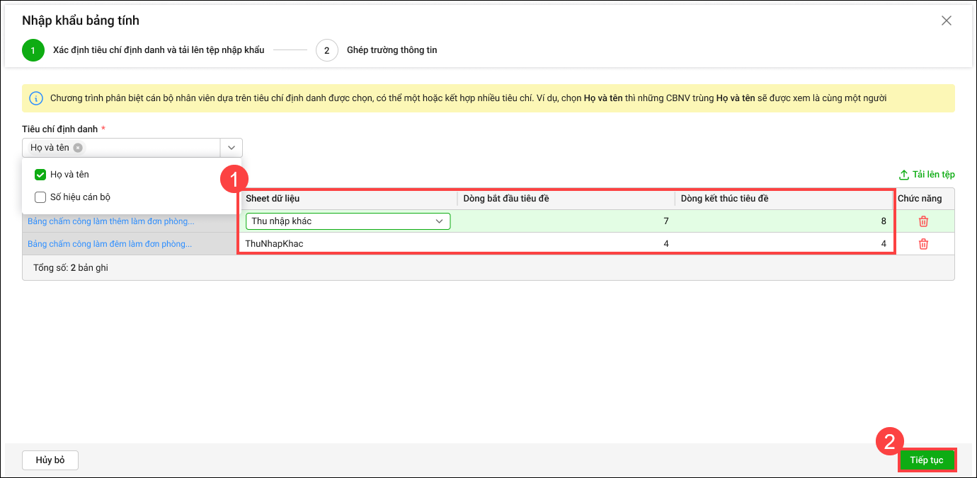 - Chọn Tải tệp lên để tải bảng chấm công từ Excel vào phần mềm. Sau đó, chọn Sheet dữ liệu, xác định dòng tiêu đề bắt đầu và dòng tiêu đề kết thúc, rồi nhấn Tiếp tục.