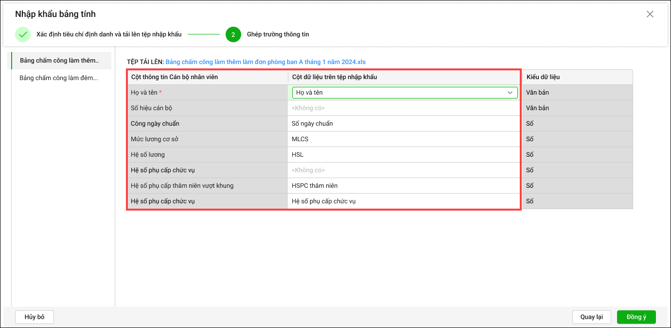 - Ghép cột dữ liệu: Đối chiếu các cột trong file Excel với các trường thông tin trên phần mềm. Nếu có cột không cần nhập, anh/chị có thể để trống, rồi nhấn Tiếp tục.