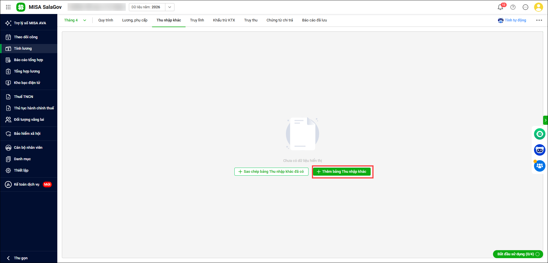 Bước 1: Vào menu Tính lương\Thu nhập khác\Thêm bảng Thu nhập khác.