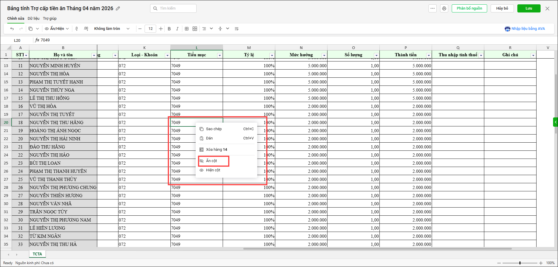 6. Nếu anh/chị muốn ẩn cột thông tin theo nhu cầu, anh/chị chọn vùng đó, nhấn chuột phải chọn ẩn cột