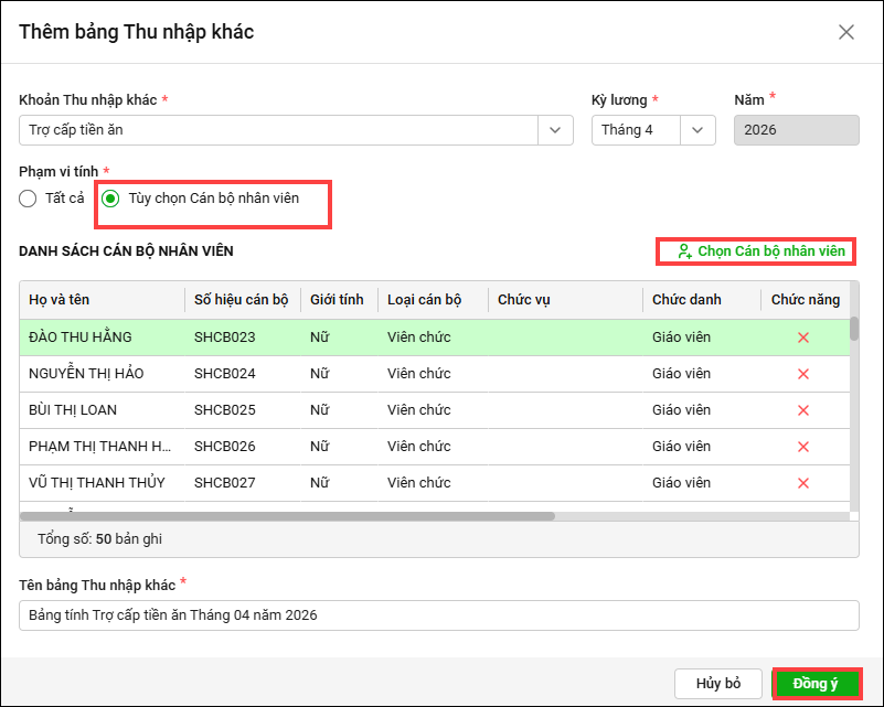 - Trường hợp tất cả CBNV trong đơn vị đều được hưởng khoản thu nhập khác, anh/chị tích chọn Tất cả.