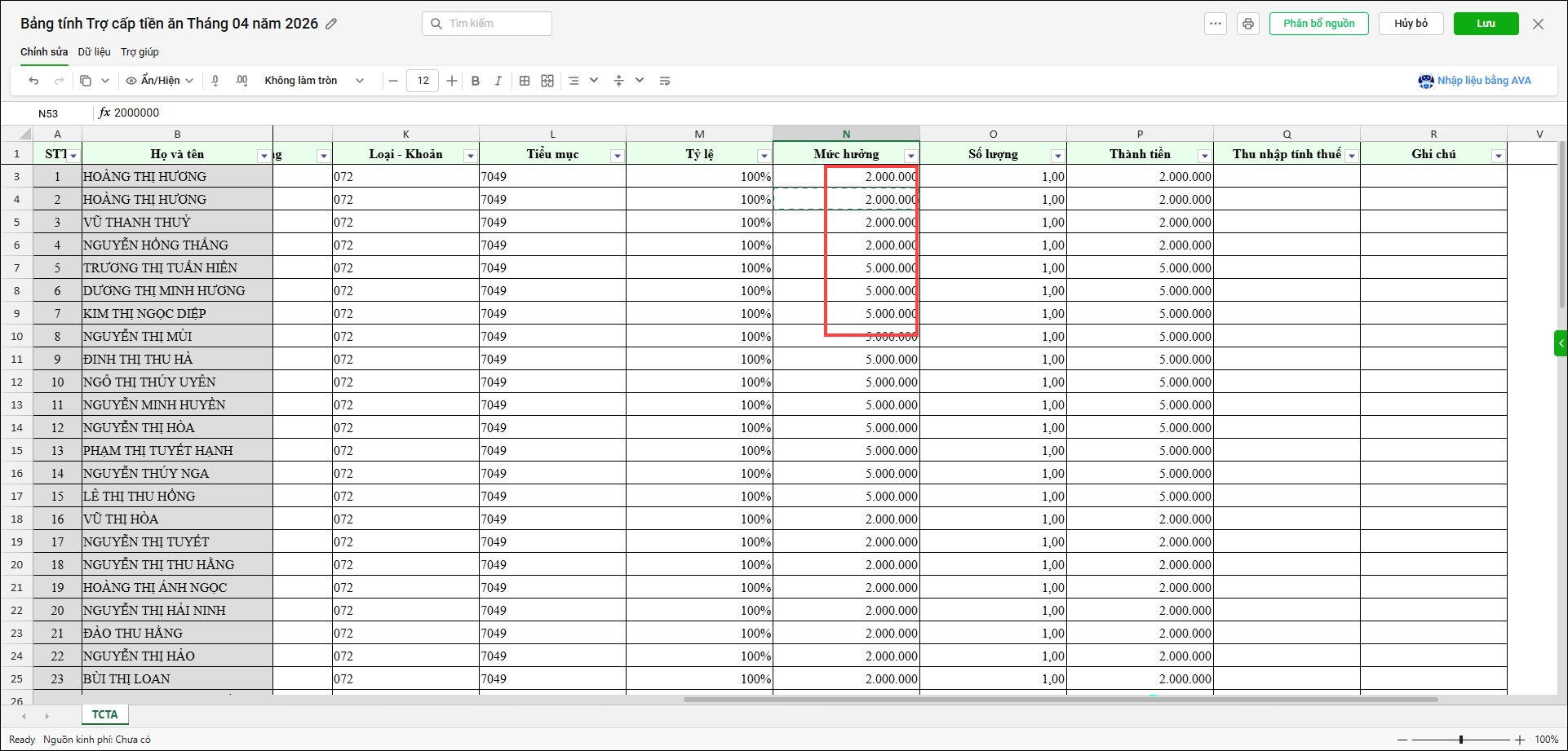 4. Với các khoản phụ cấp hưởng theo Số tiền: Anh/chị khai báo thông tin các cột thành phần như Số tiền và Số lượng, phần mềm tự động tính cột Thành tiền