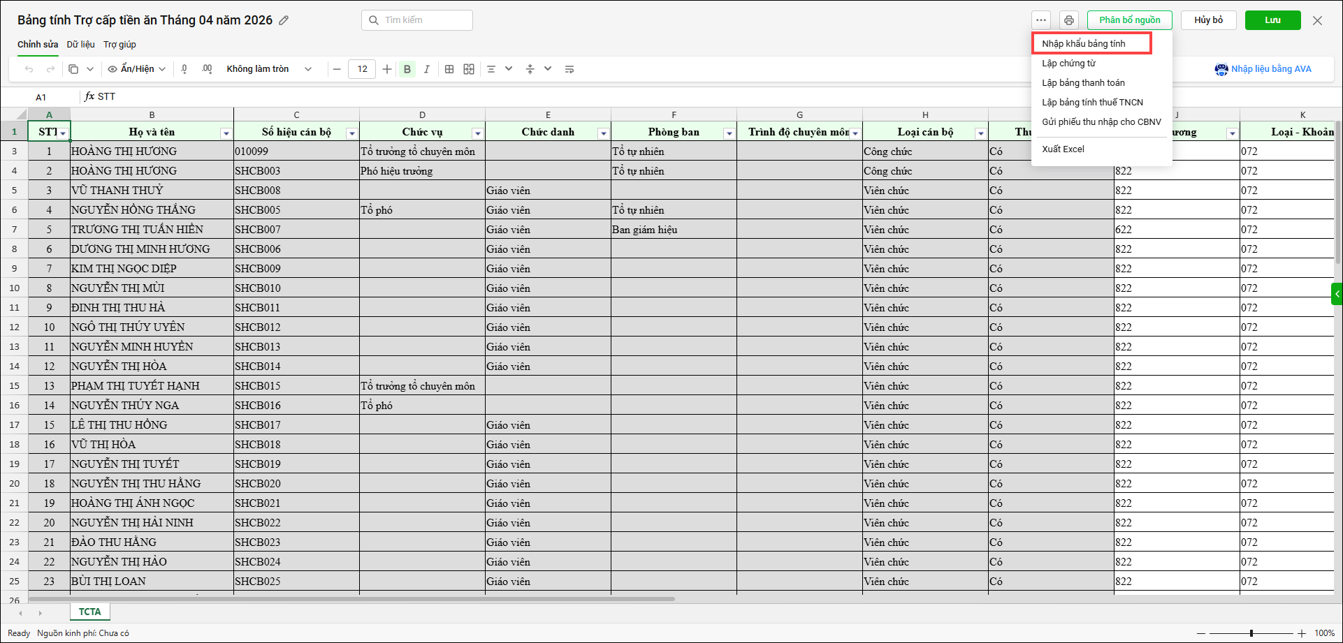 2. Tại các đơn vị HCSN, khi phát sinh làm thêm, làm đêm, để ghi nhận bảng chấm công từ các phòng ban, sau đó nhập số ngày công vào bảng tính thu nhập khác để tính lương cho CBNV. Anh/chị chọn Nhập khẩu bảng tính