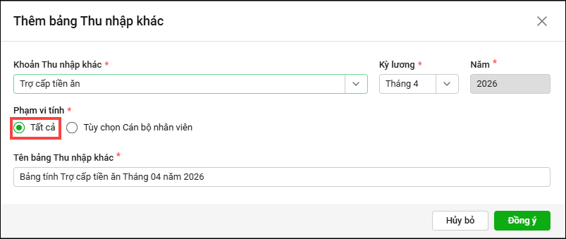 - Phạm vi tính: Anh/chị xác định CBNV được hưởng khoản thu nhập khác.