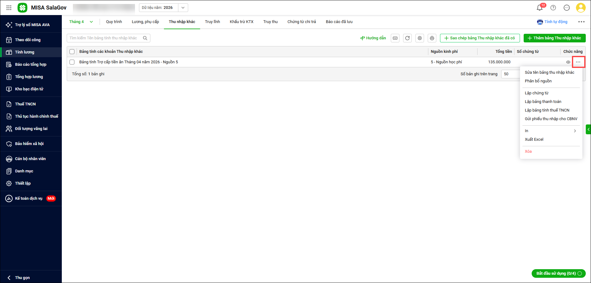 Bước 1: Sau khi lập bảng thu nhập khác, anh/chị xác định nguồn chi trả tại đơn vị bằng cách chọn Phân bổ nguồn