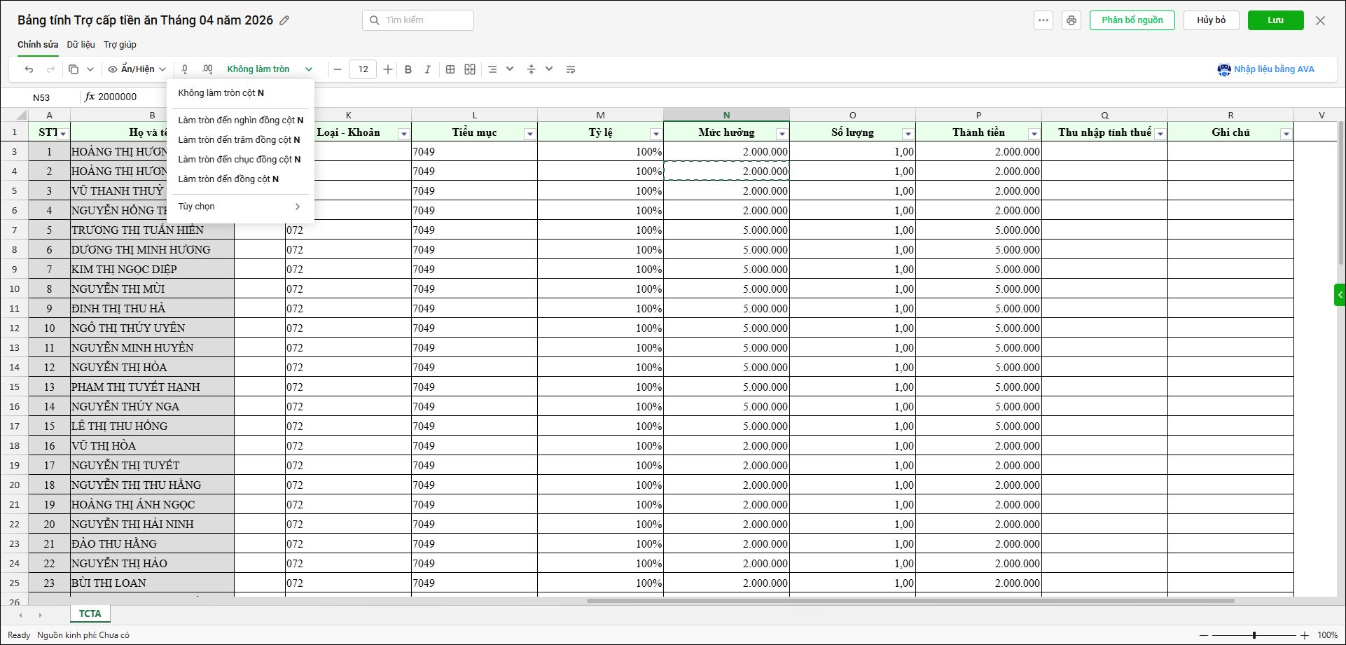 5. Nếu muốn làm tròn số liệu, anh/chị chọn vùng muốn làm trong số liệu, sau đó chọn quy tắc làm tròn.