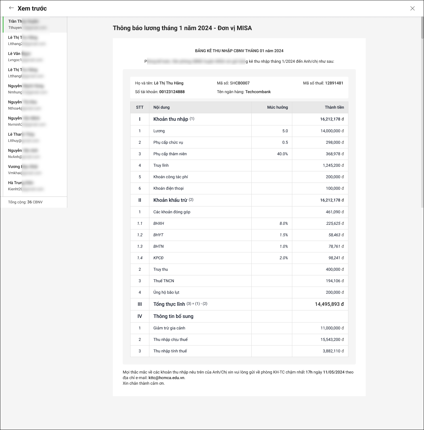 Ví dụ: Khi lập xong bảng lương, phụ cấp, anh/chị có thể dễ dàng gửi thông tin thu nhập cho CBNV