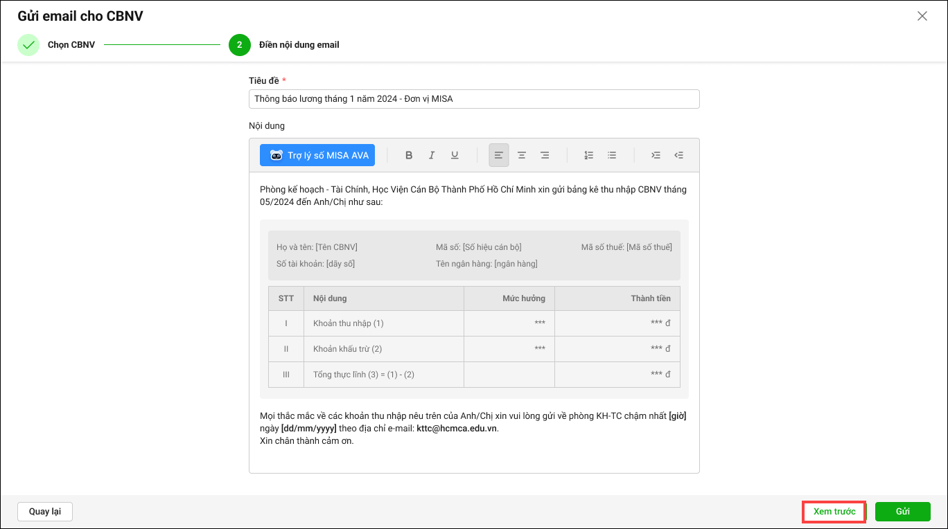 - Có thể chọn Xem trước để xem trước nội dung mail sẽ gửi đi cho CBNV