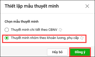 3. Chọn mẫu thuyết minh là Thuyết minh chi tiết theo CBNV hoặc Thuyết minh nhóm theo khoản lương, phụ cấp.
