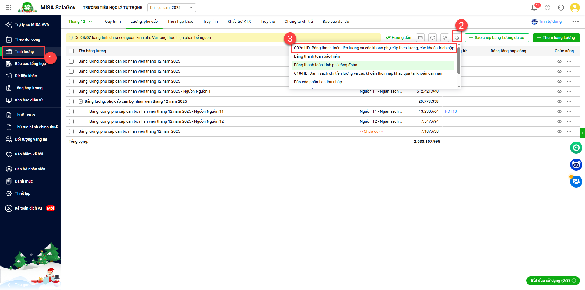 1. Vào mục Tính lương/Lương phụ cấp. Nhấn chọn biểu tượng máy in, sau đó chọn C02 – HD: Bảng thanh toán tiền lương và các khoản phụ cấp theo lương các khoản trích nộp