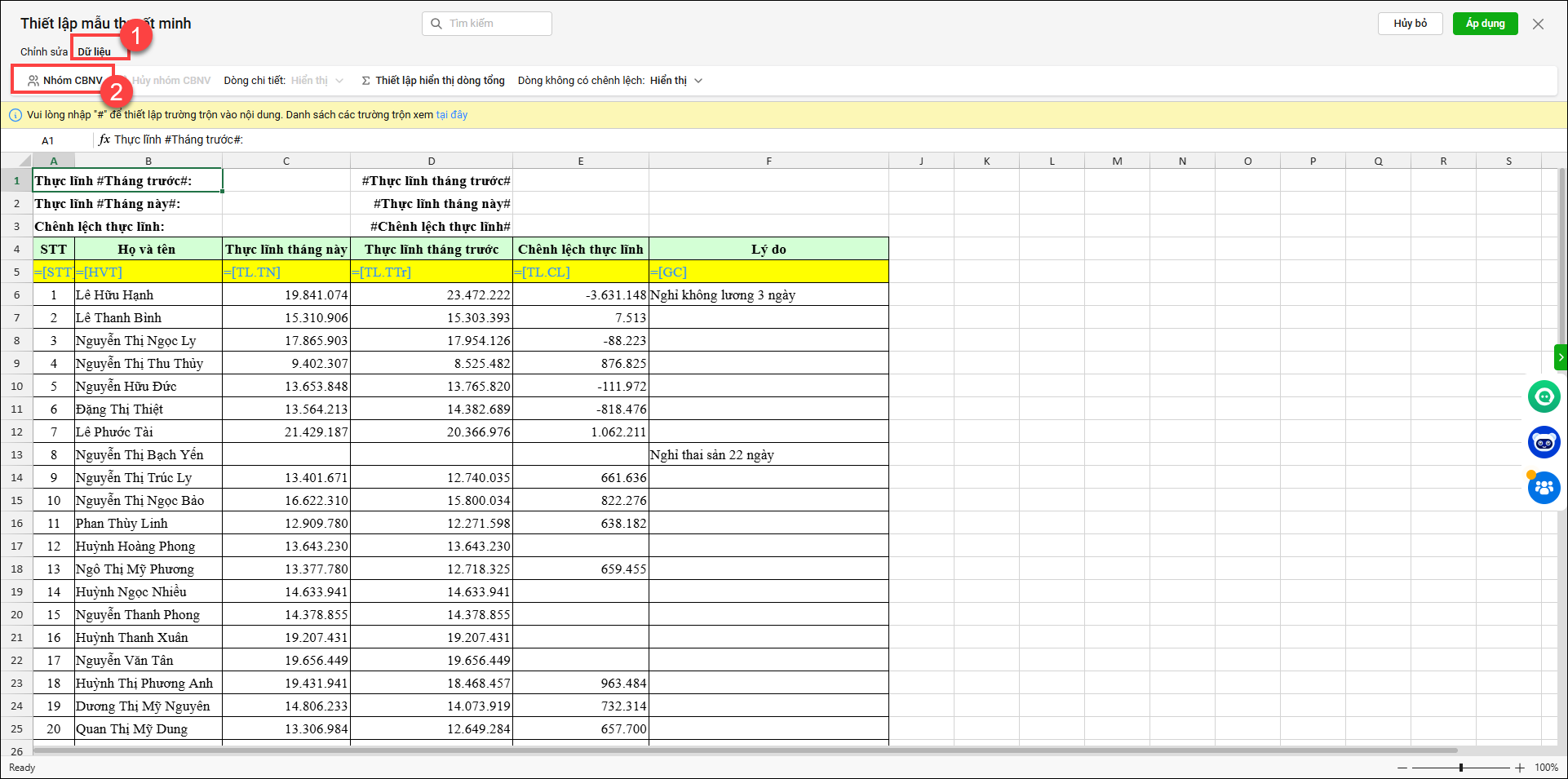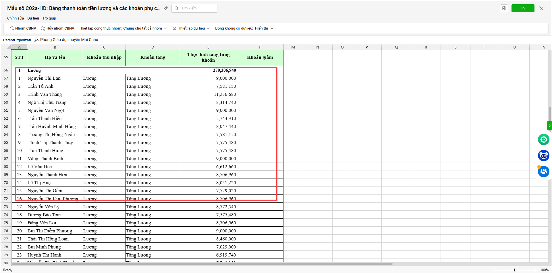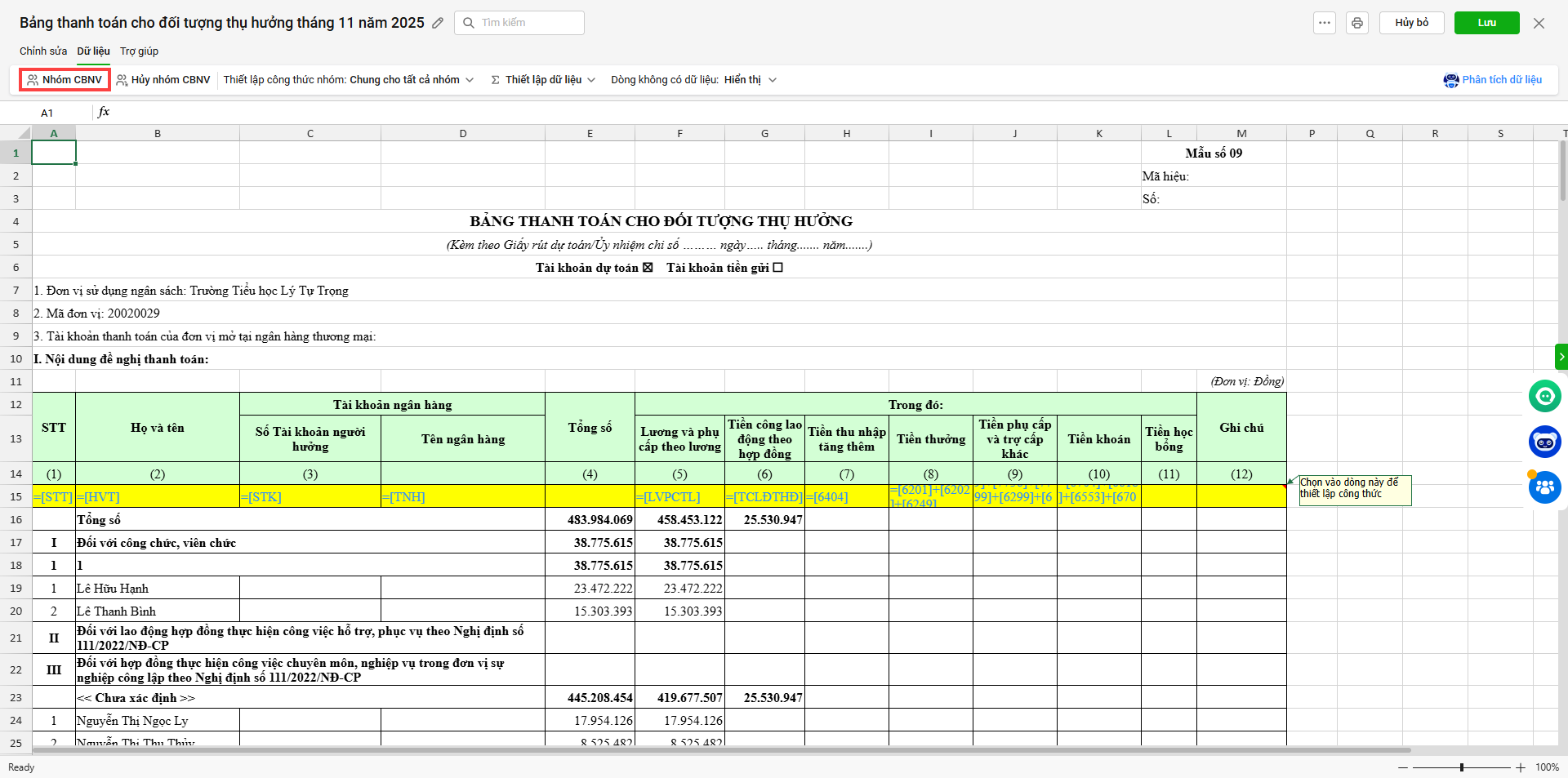 Bước 3: Nếu cần gom Gom nhóm cán bộ nhân viên theo các tiêu chí, vào mục Dữ liệu, chọn Nhóm cán bộ nhân viên