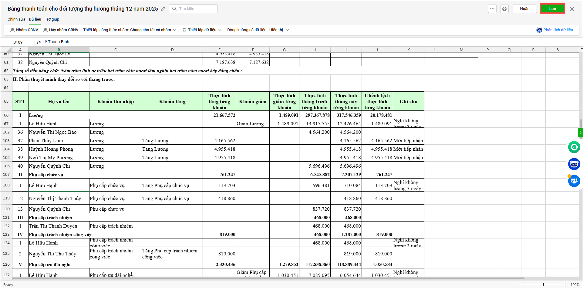 => Hệ thống sẽ tự động tạo mục II. Phần thuyết minh thay đổi so với tháng trước dựa trên mẫu đã thiết lập.