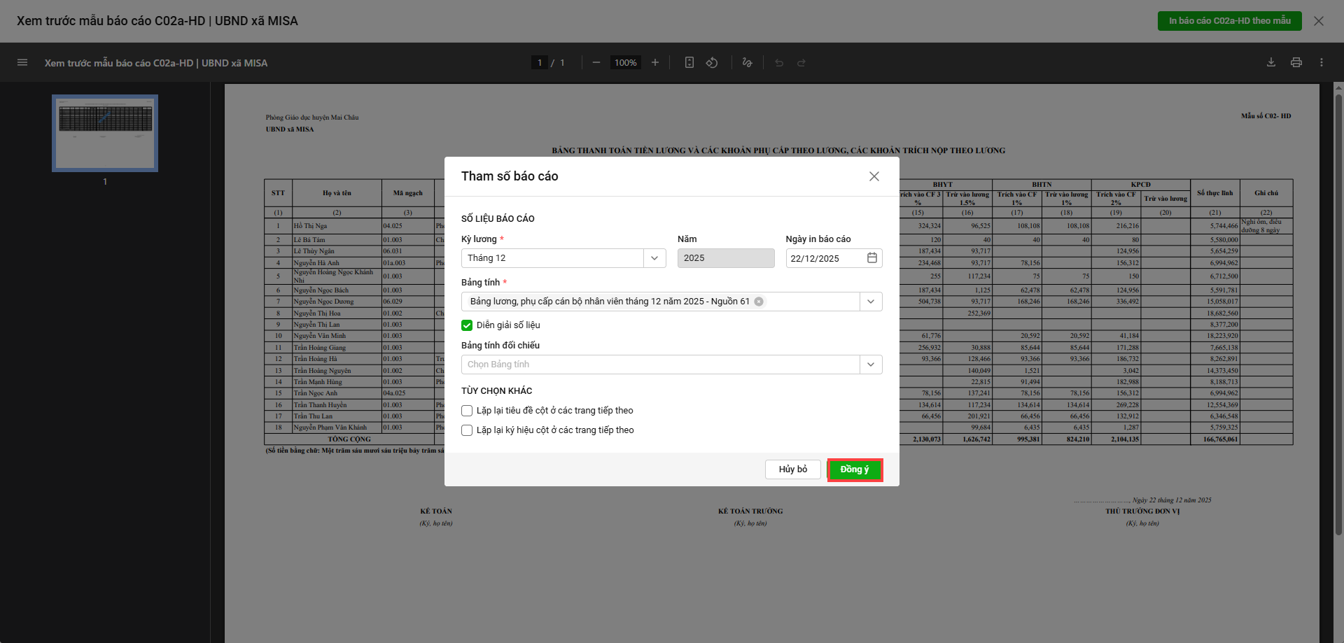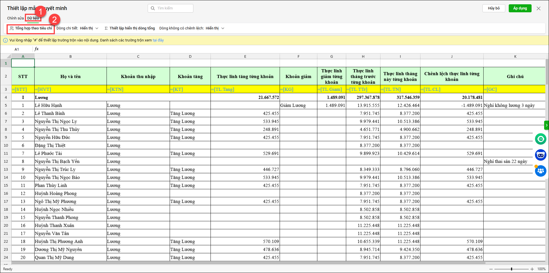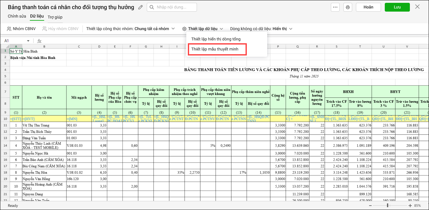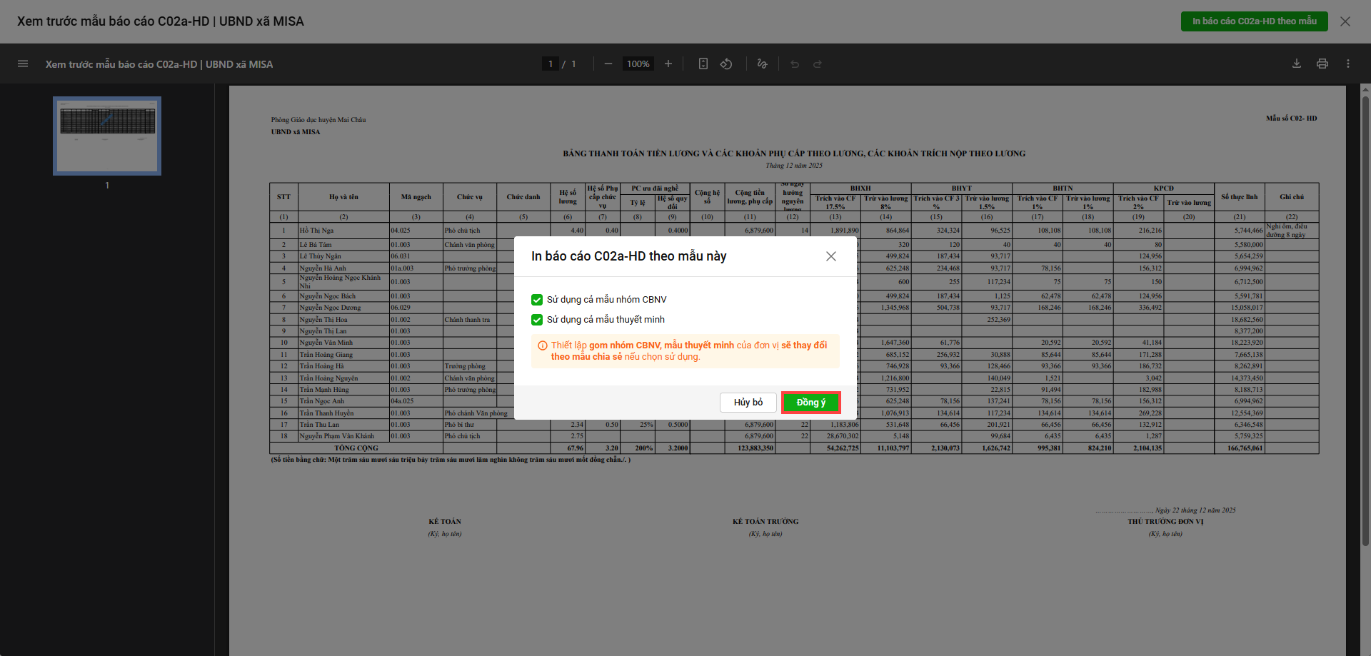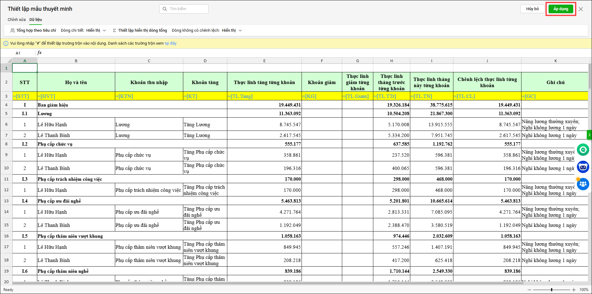 3.4. Phần mềm hiển thị mẫu thuyết minh đã được tổng hợp tiêu chí theo khoản lương, phụ cấp. Nhấn Áp dụng.