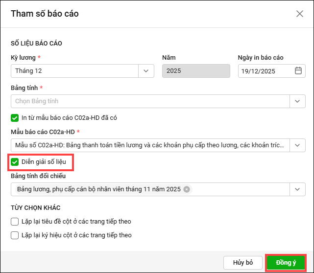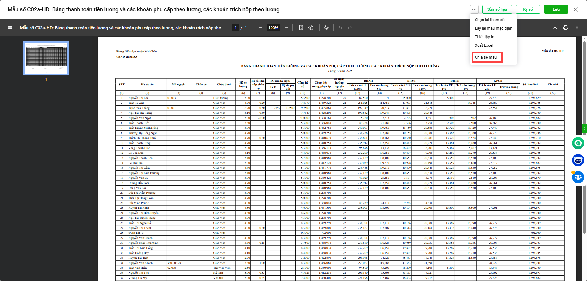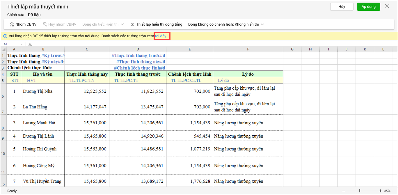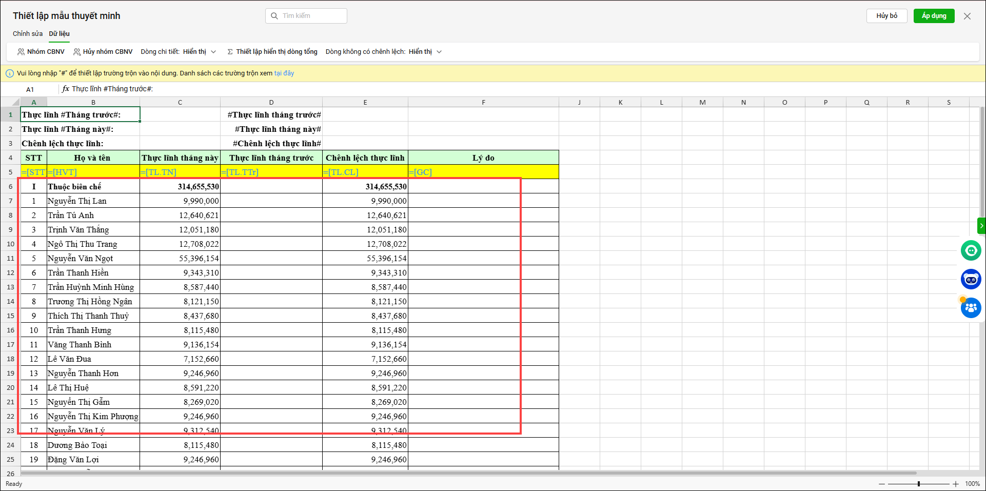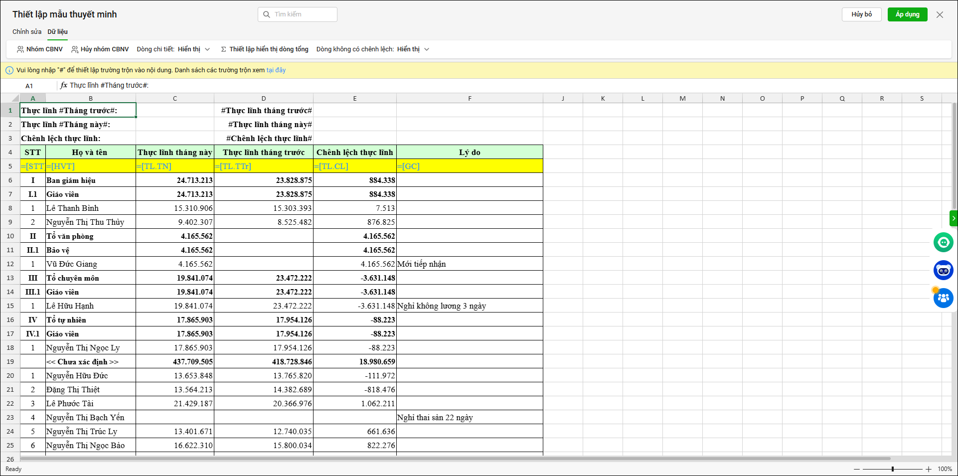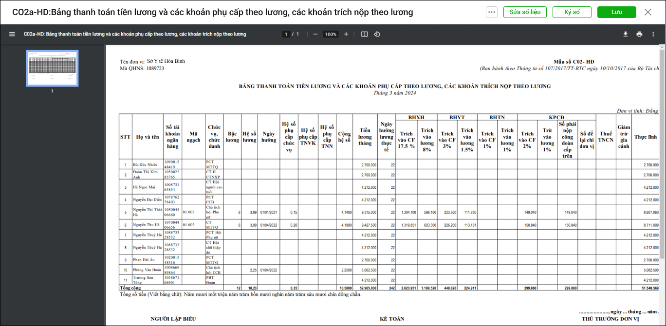 3.4. Phần mềm hiển thị mẫu thuyết minh đã được tổng hợp tiêu chí theo khoản lương, phụ cấp. Nhấn Áp dụng.