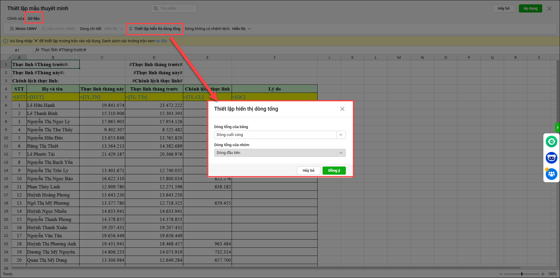 Bước 6: Tại mục Dữ liệu, có thể thiết lập hiển thị vị trí của dòng tổng theo nhu cầu.