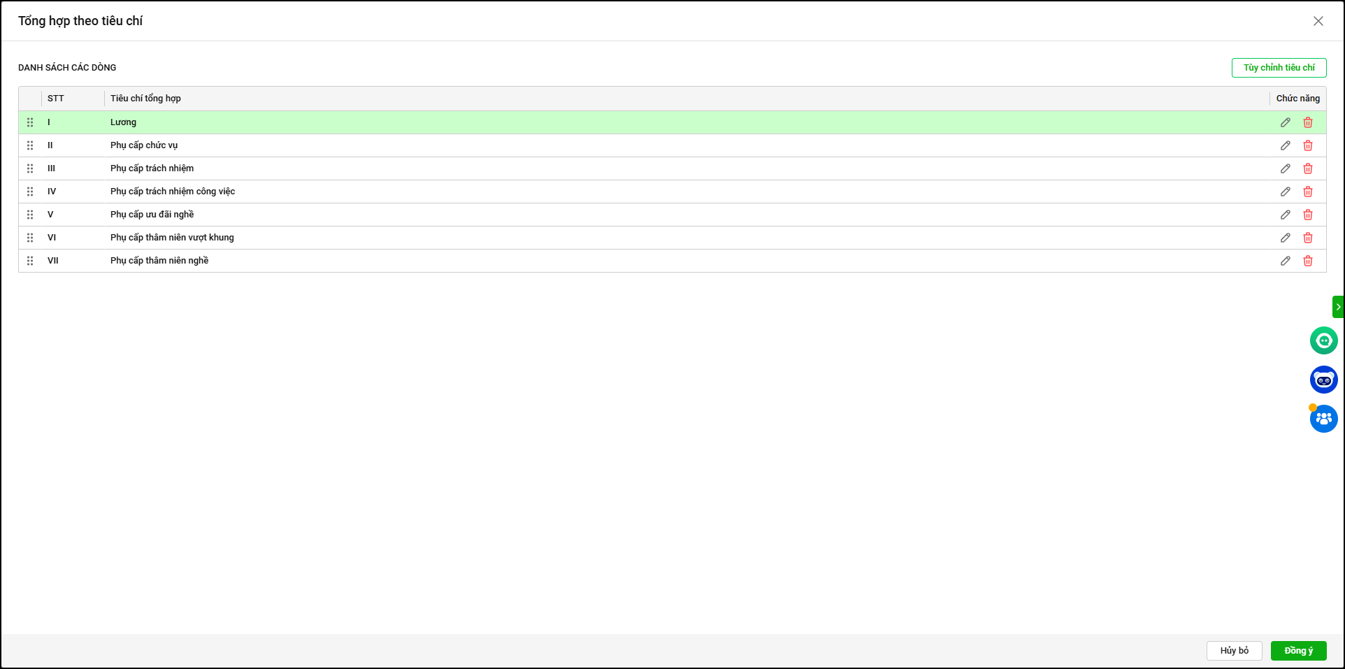 Phần mềm hiển thị các tiêu chí tổng hợp gồm: Lương; Phụ cấp chức vụ; Phụ cấp trách nhiệm; Phụ cấp trách nhiệm công việc; Phụ cấp ưu đãi nghề; Phụ cấp thâm niên vượt khung; Phụ cấp thâm niên nghề.