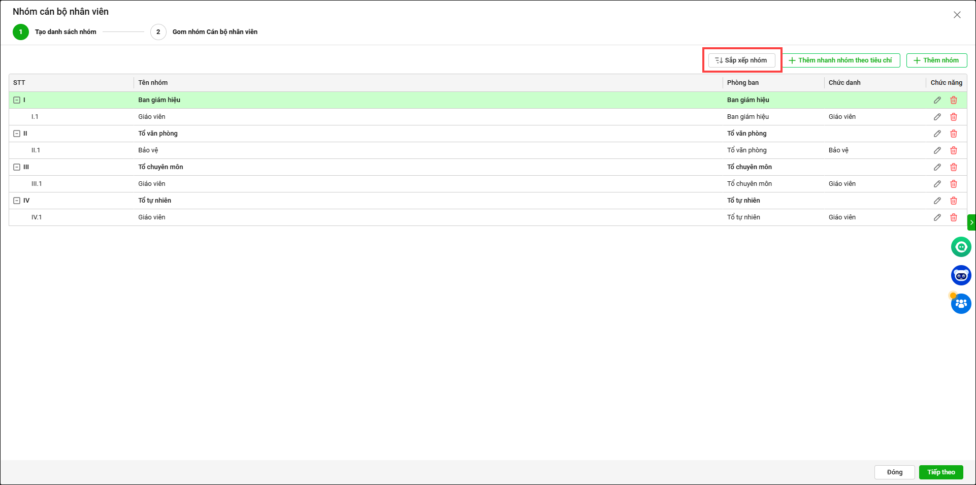 • Anh/chị muốn chỉnh lại thứ tự hiển thị giữa các nhóm có thể nhấn chọn Sắp xếp nhóm.