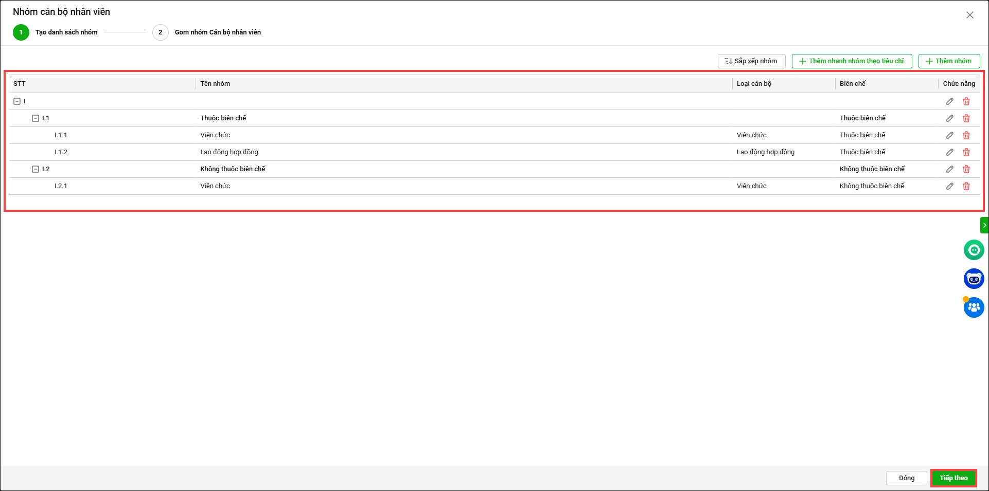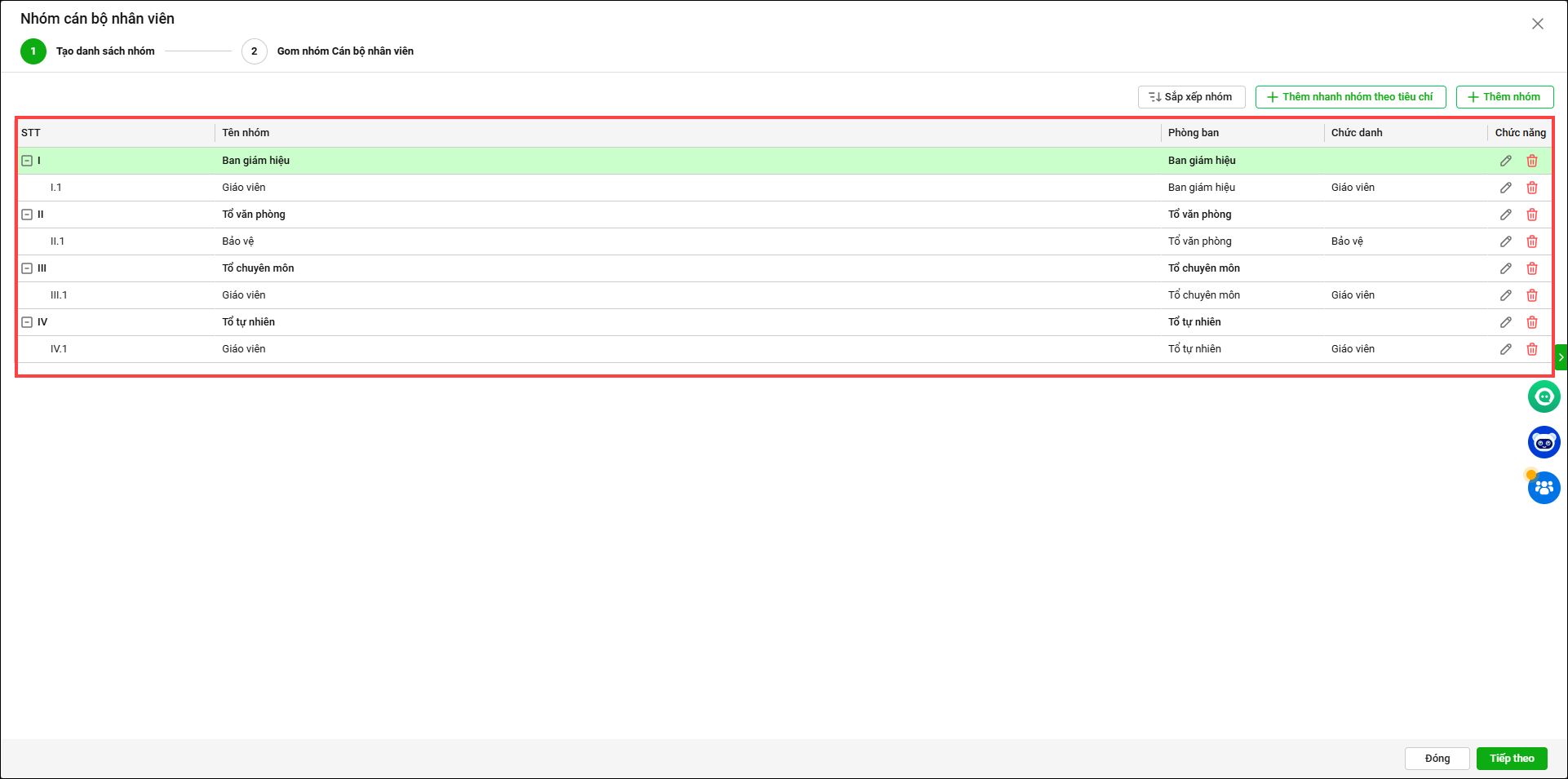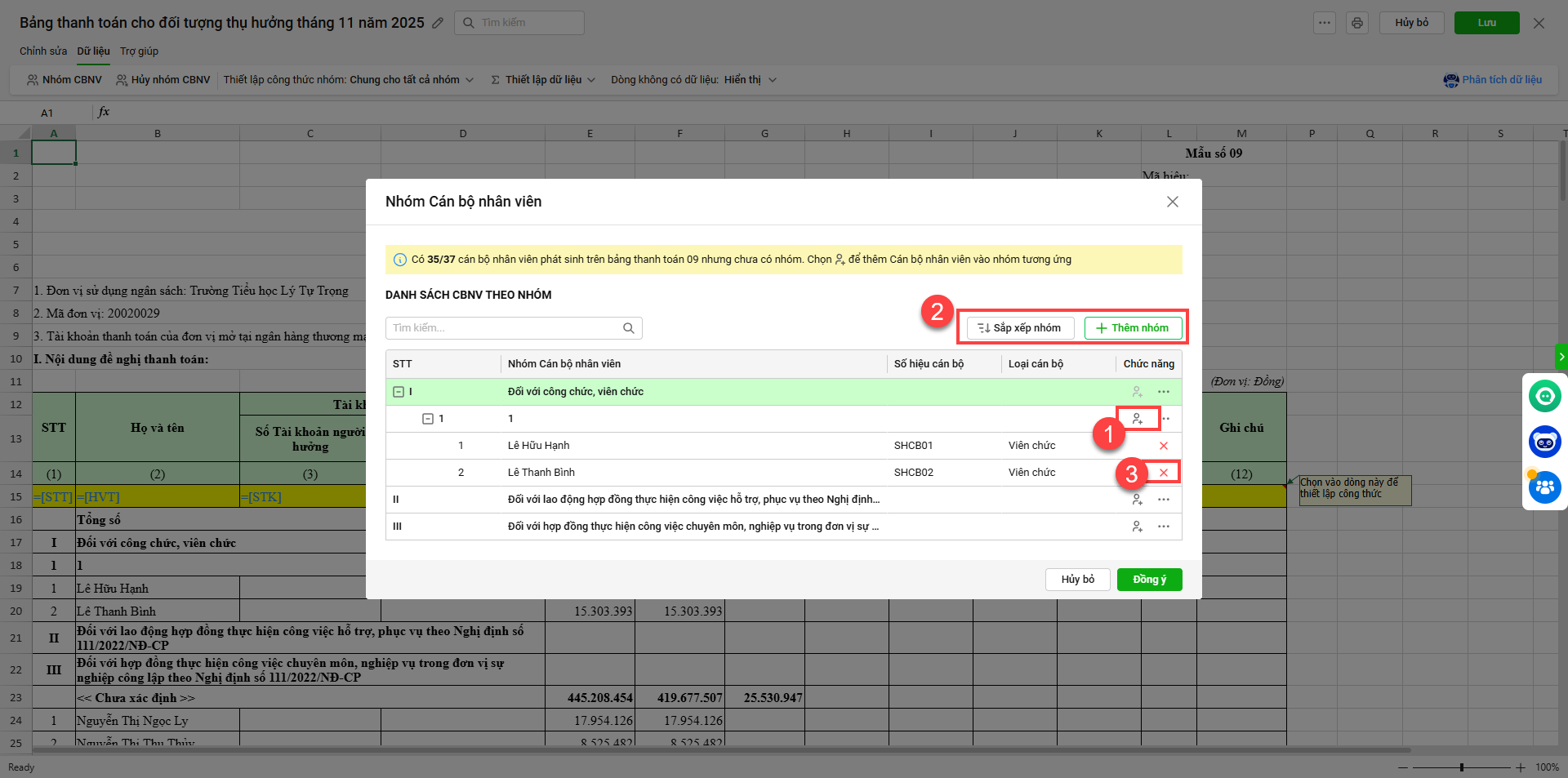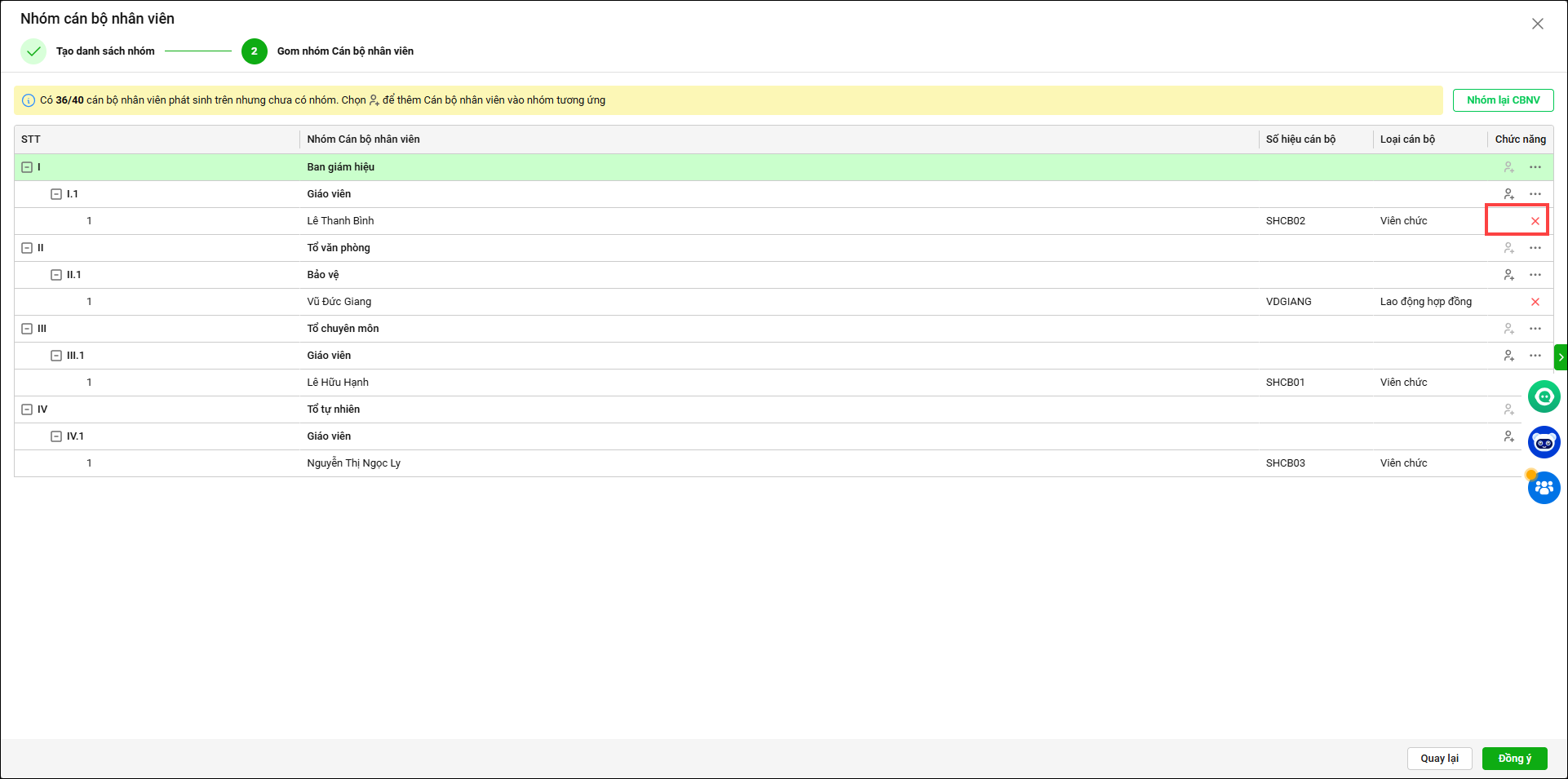 • Xóa CBVN khỏi nhóm: Nhấn vào biểu tượng thùng rác (3) để loại CBNV khỏi nhóm đã tạo