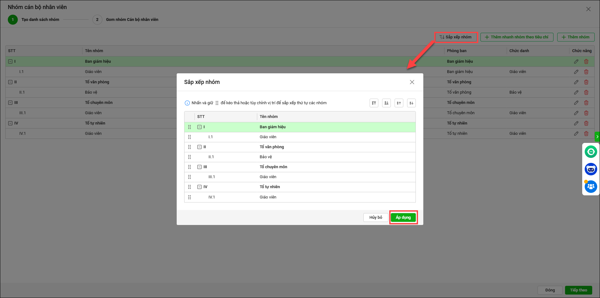• Sau đó nhấn và giữ nút ở đầu mỗi nhóm để kéo/thả, tùy chỉnh vị trí của các nhóm đã tạo. Nhấn Áp dụng
