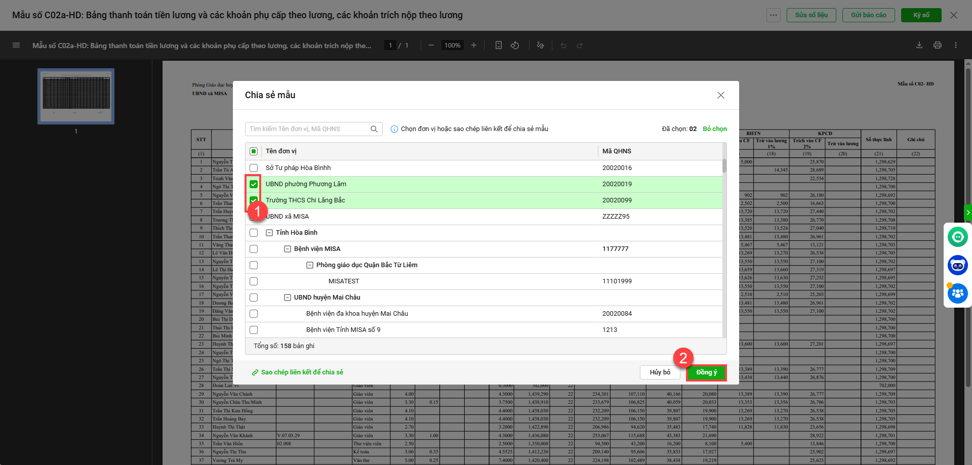 • Tích chọn đơn vị muốn chia sẻ báo cáo, chọn đồng ý, phần mềm sẽ tự động gửi báo cáo này đến các đơn vị đã được chọn.
