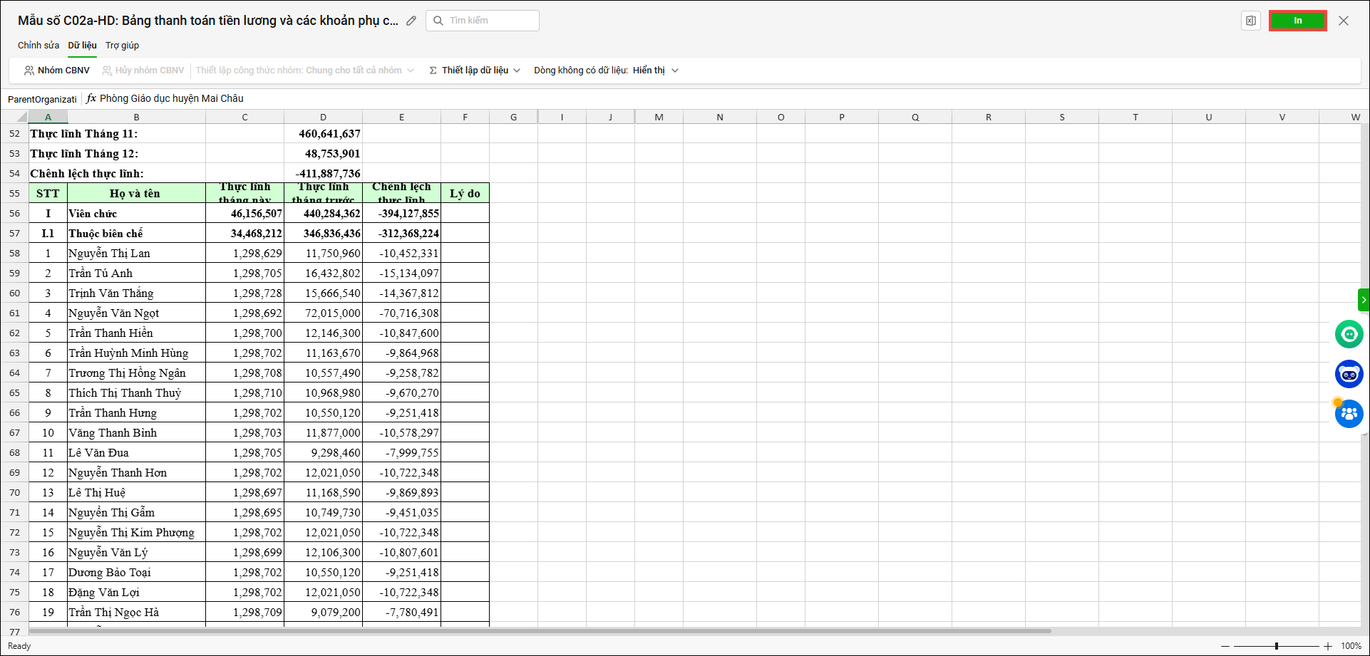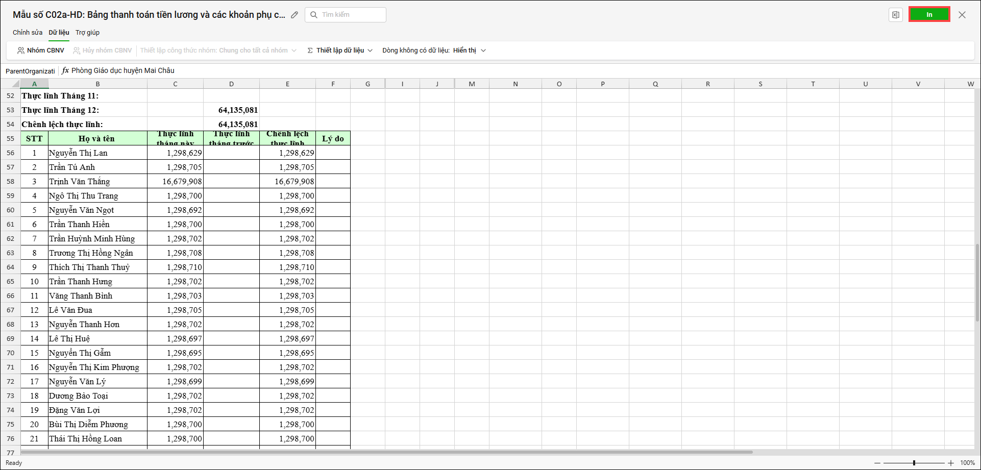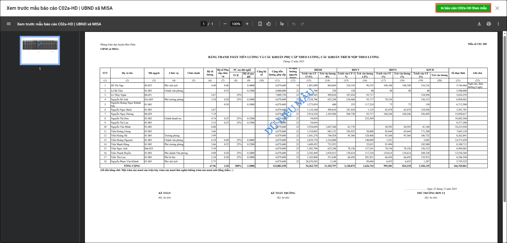 Sau khi lưu anh/chị chọn vào biểu tượng in để in bảng C02a – HD để nộp lên cấp trên hoặc lưu trữ