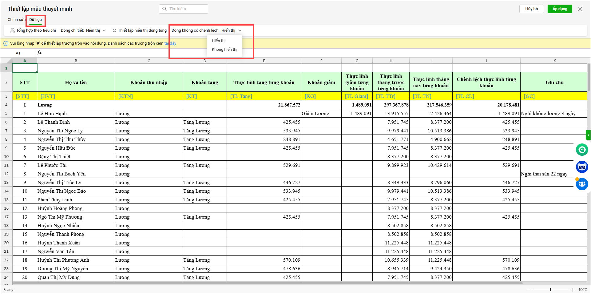 Bước 4: Khi thiết lập mẫu thuyết minh, Anh/chị có thể vào thiết lập Ẩn/hiện Dòng không có chênh lệch.