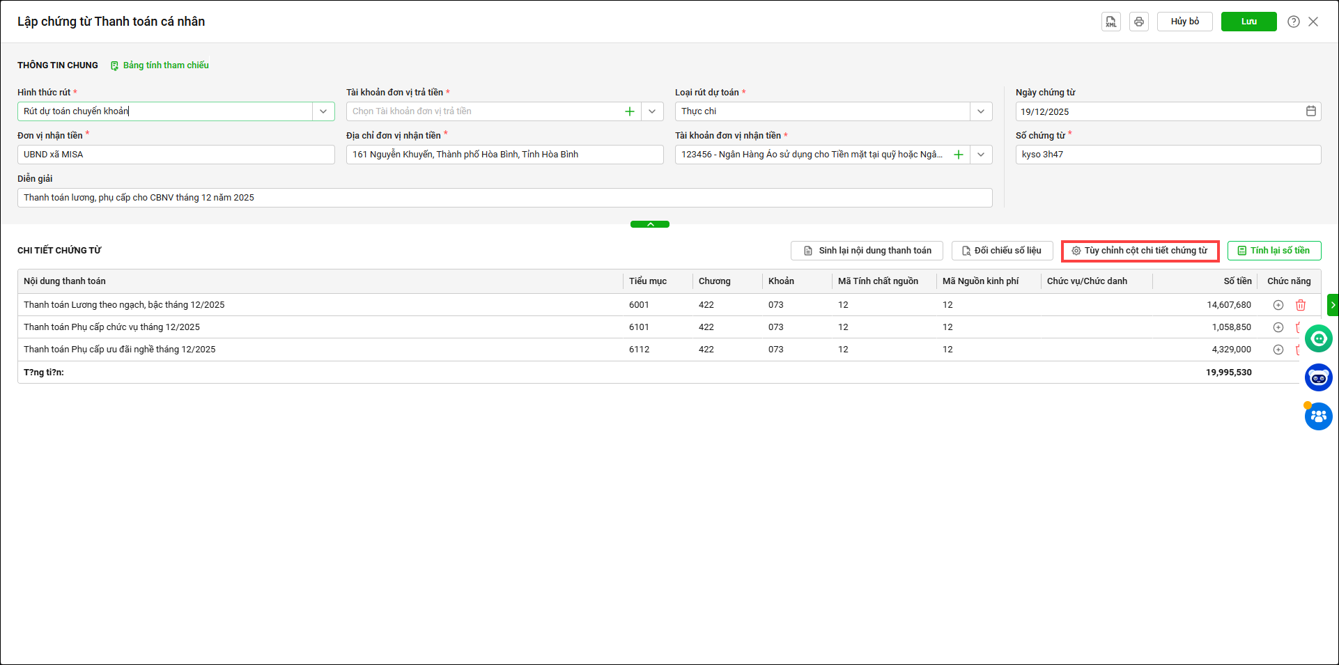 3. Phần mềm hiển thị màn hình Lập chứng từ Thanh toán cá nhân