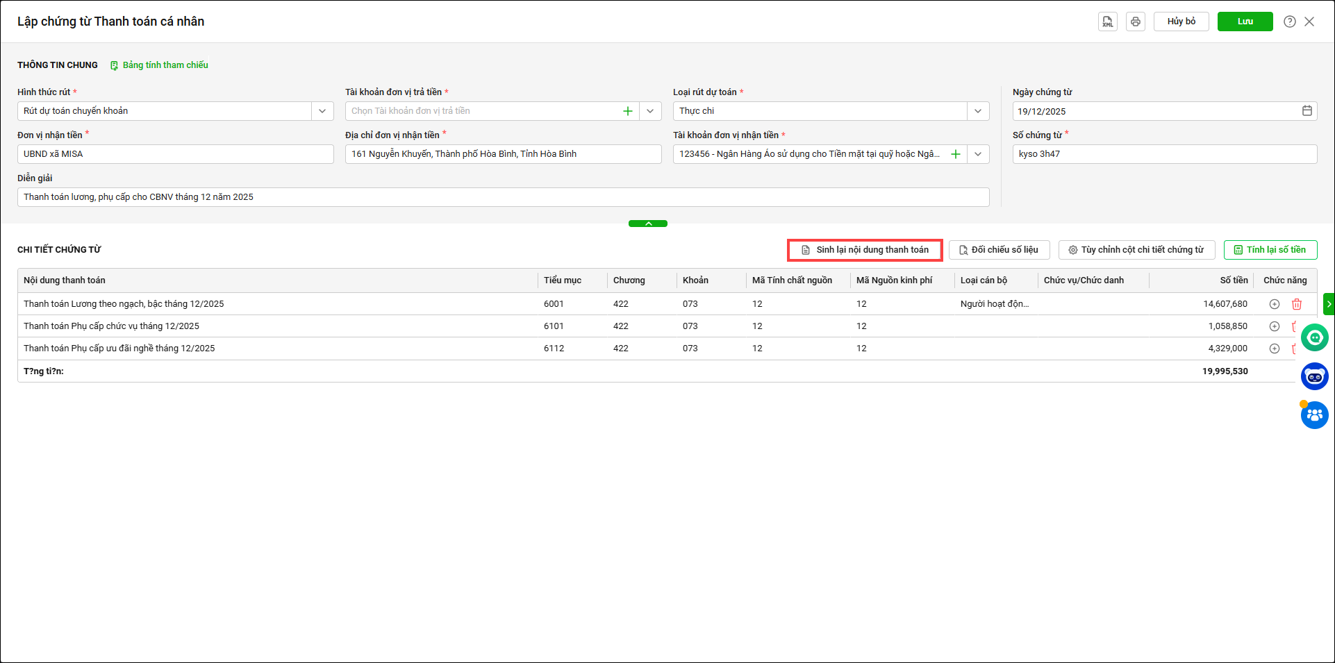 - Nhấn Sinh lại nội dung thanh toán