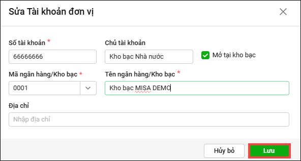 • Anh/chị sửa tên đơn vị, mã ngân hàng/kho bạc sau đó nhấn Lưu