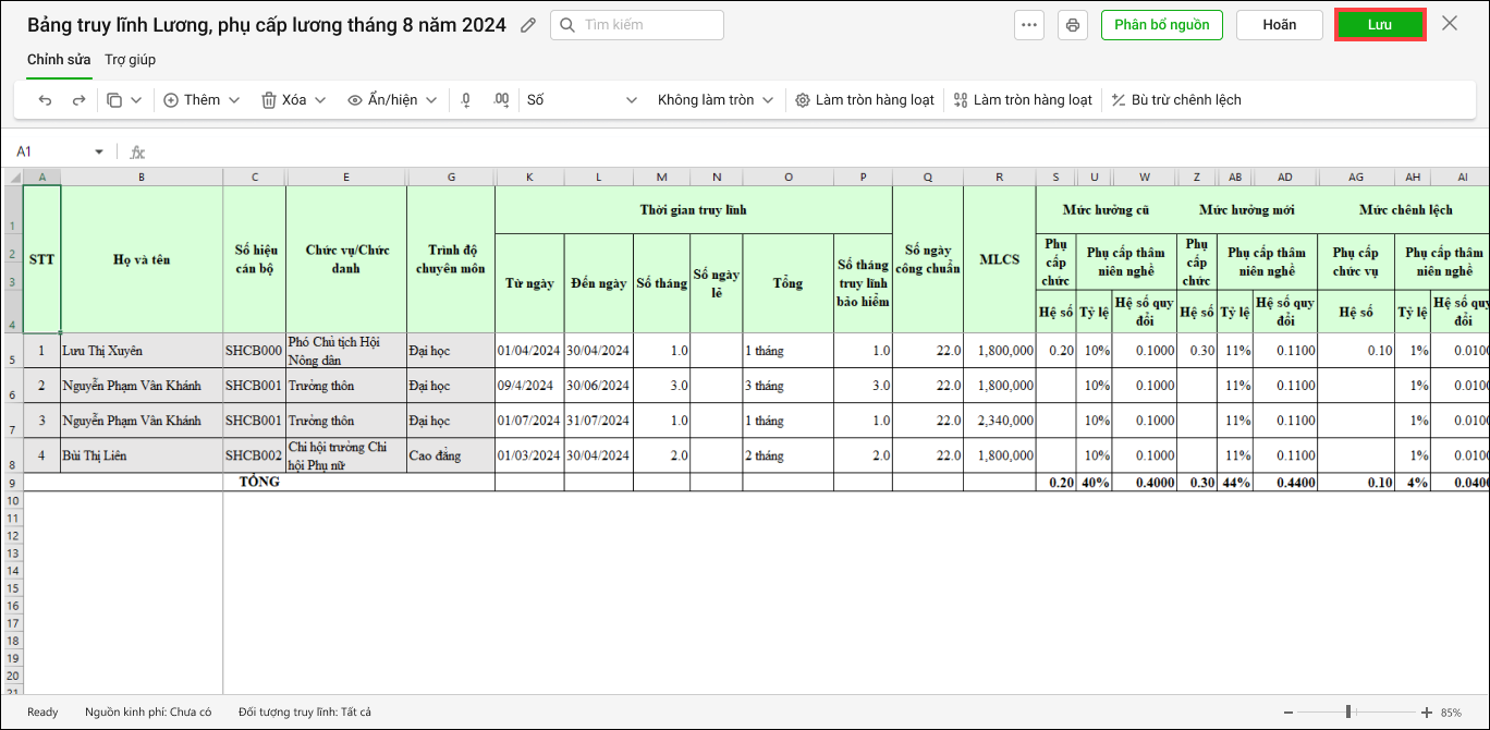 4. Phần mềm hiển thị Bảng truy lĩnh Lương, phụ cấp bấm Lưu để hoàn tất