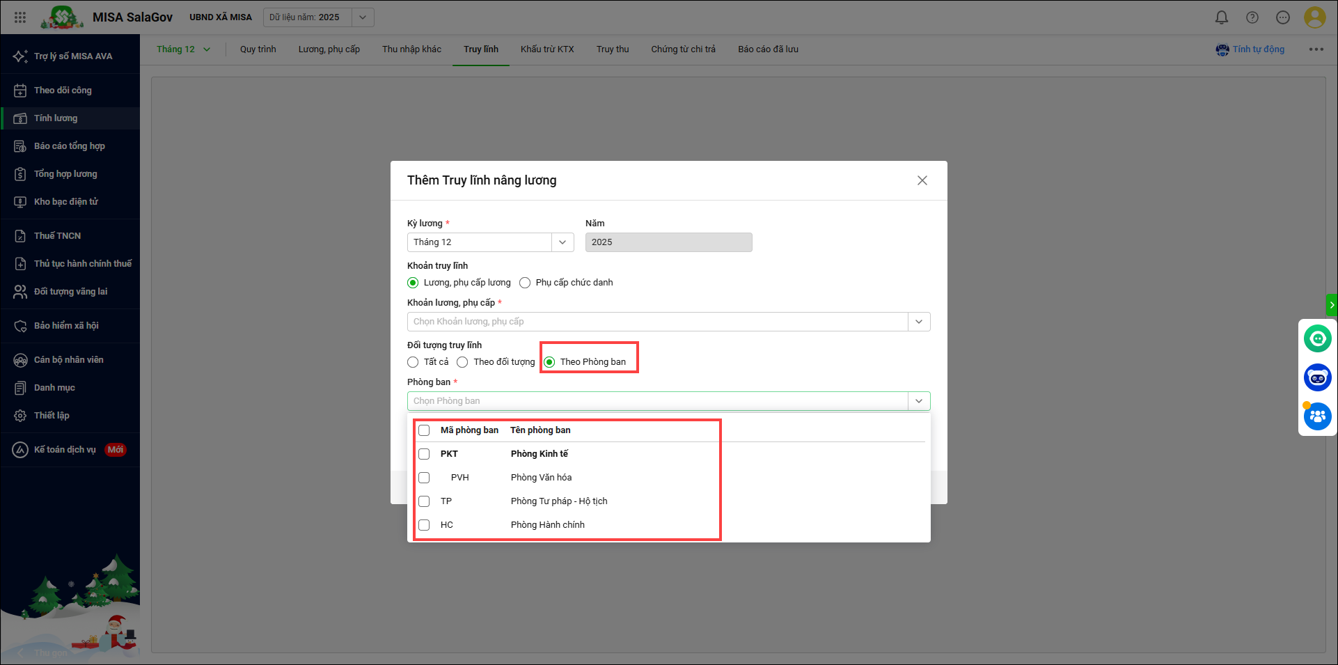- Đối tượng truy lĩnh: tích chọn ô Theo phòng ban